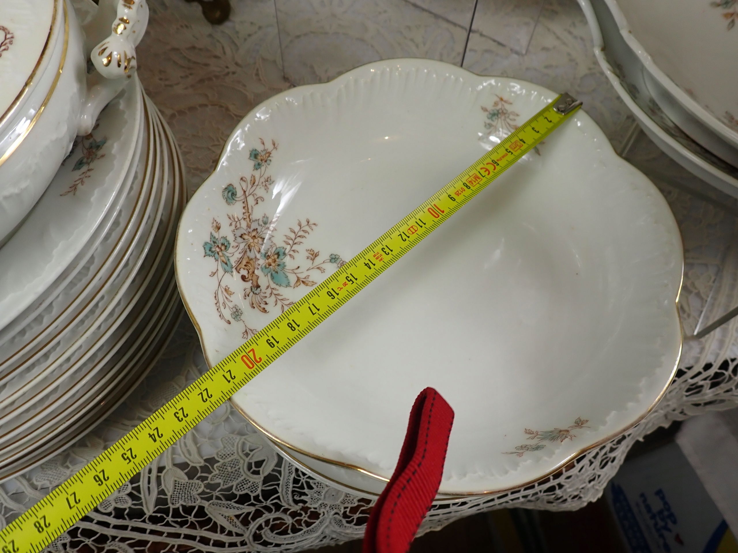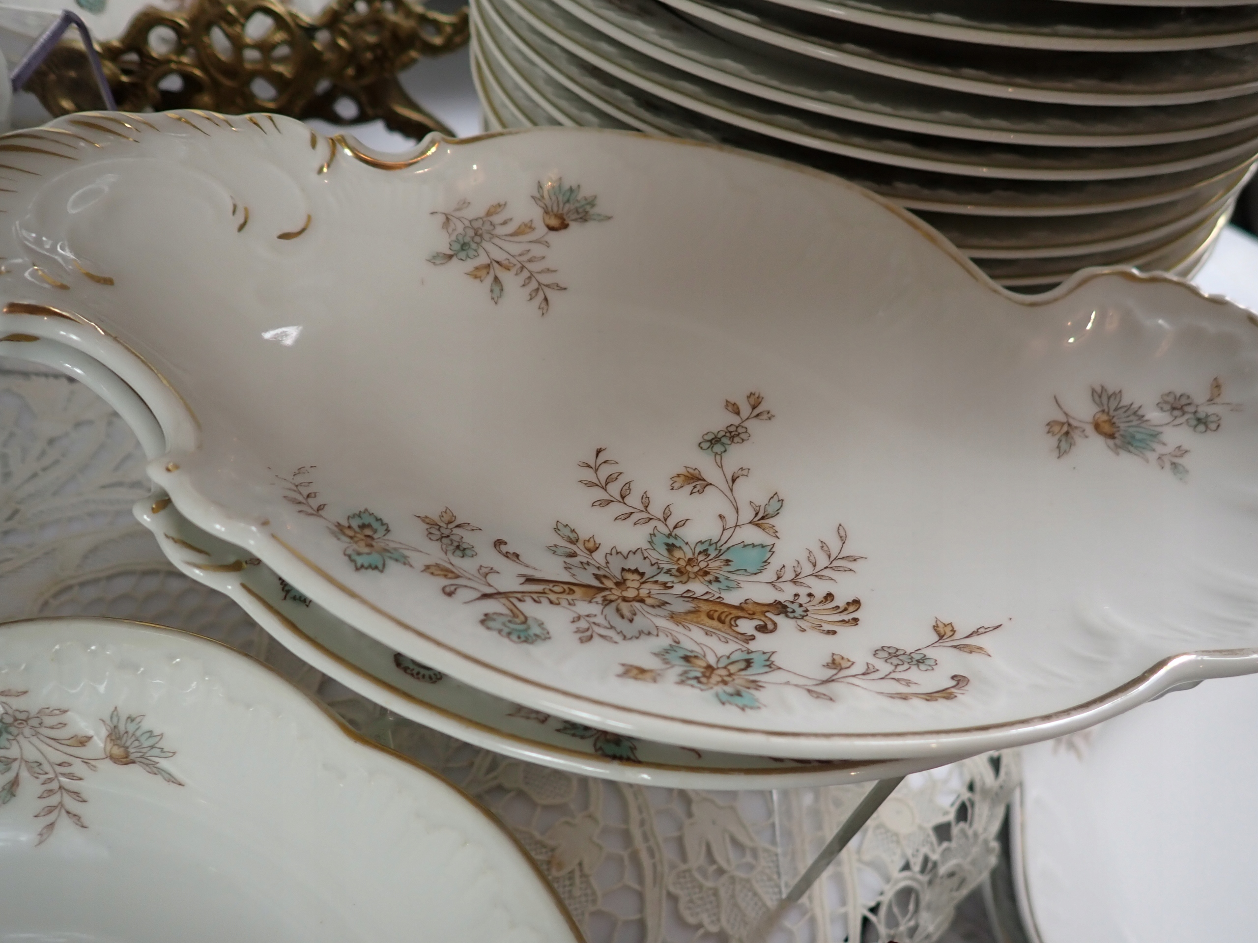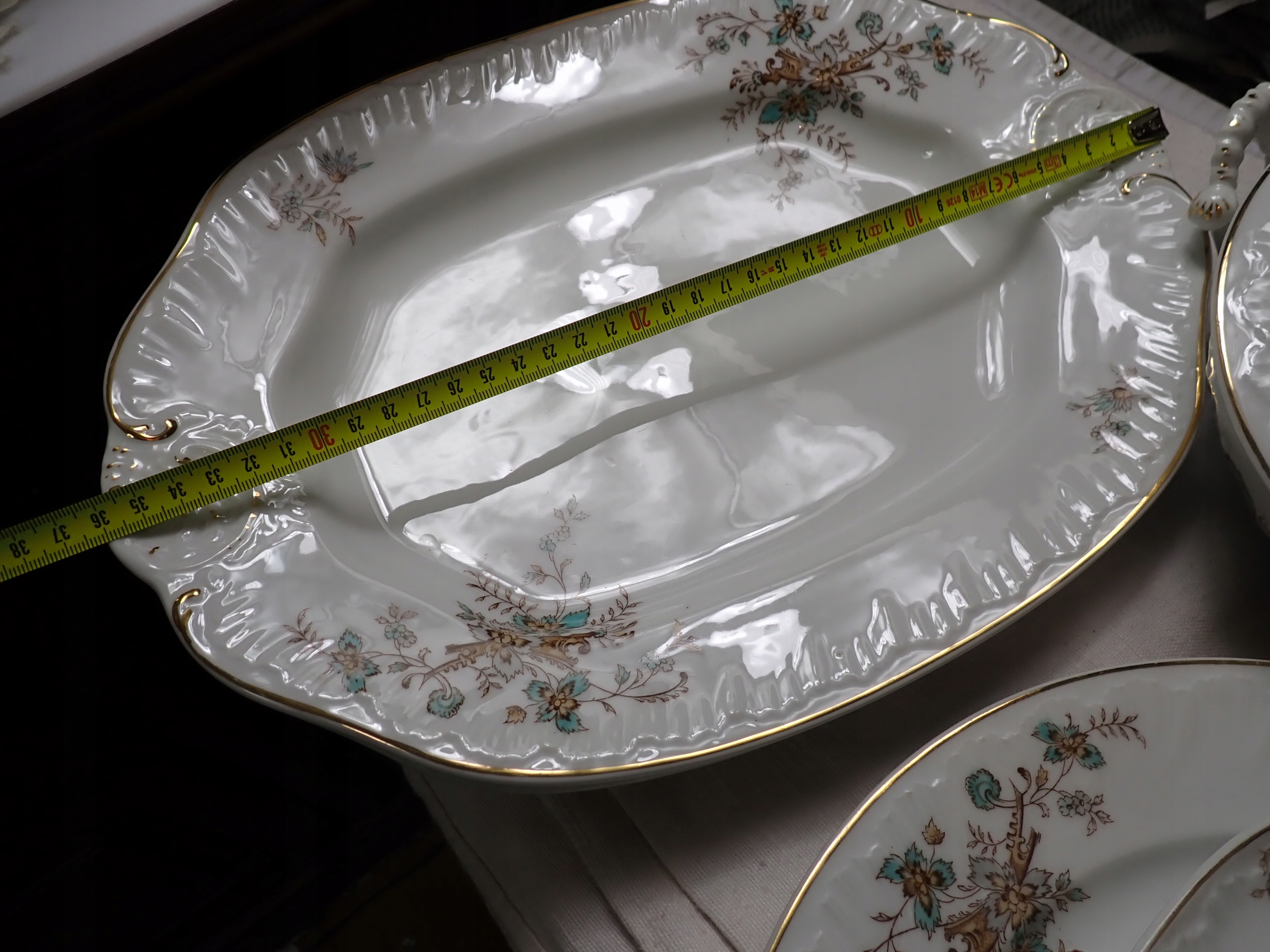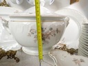 PIĘKNIE ZACHOWANY, BEZ USZCZERBKÓW, ZLOCENIA w większości RÓWNIEŻ PIĘKNIE ZACHOWANE (trochę poprzecierane na paru talerzach), CUDNE RELIEFY, DELIKATNA CIENKA PORCELANA., SECESYJNE, PIĘKNE FORMY .. PO PROSTU UNIKAT.