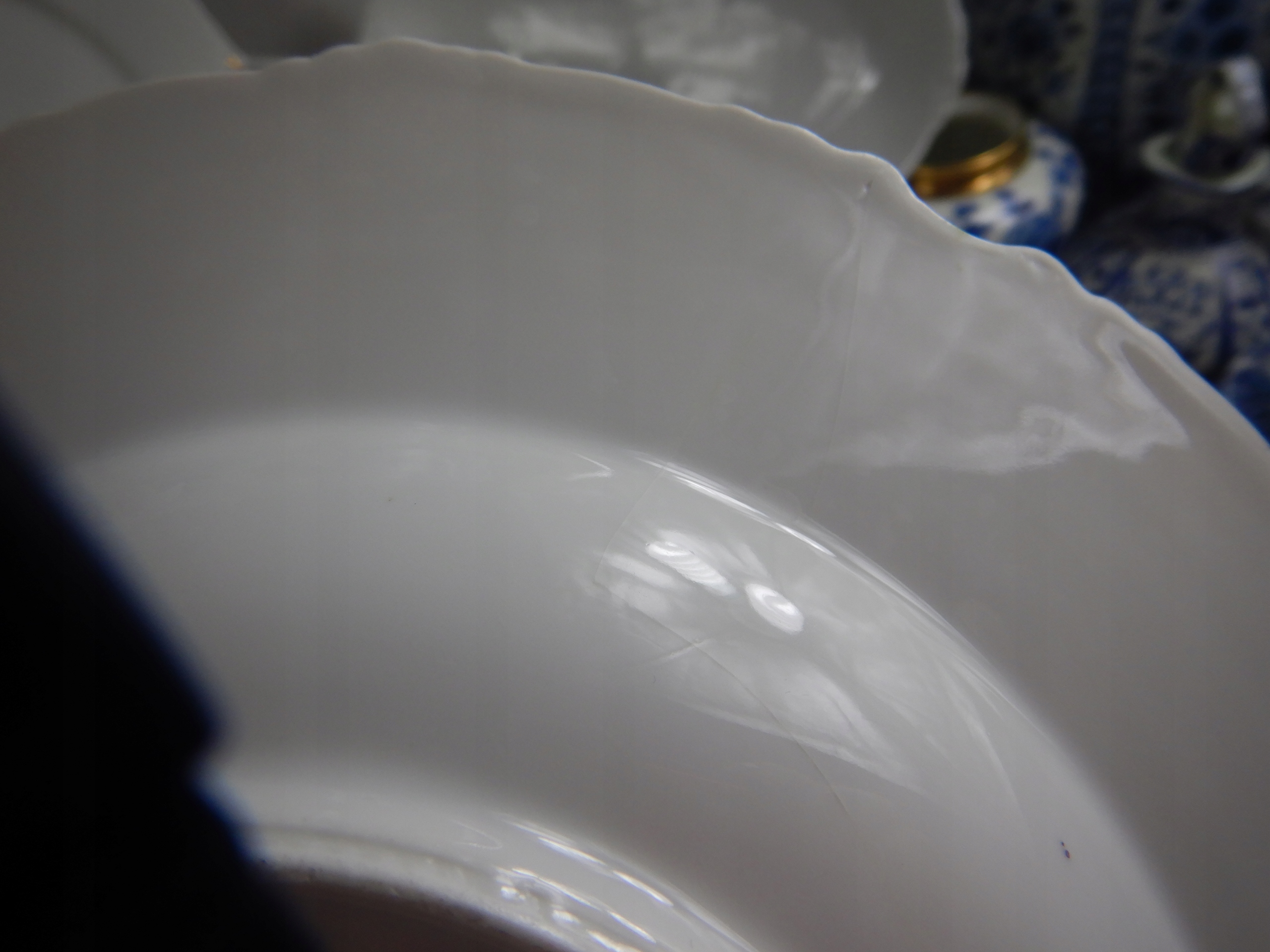 12 talerzy obiadowych (jeden czy dwa mają ubytki na krawędziach, co nie jest bardzo widoczne, bo krawędzie pofalowane)