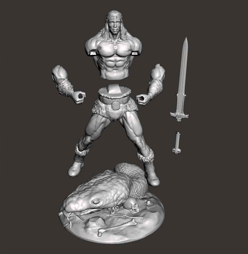 Conan - znany jako Conan Barbarzyńca i Conan Cimmeryjczyk (od nazwy jego ojczyzny, Cimmeria) - jest fikcyjną postacią literacką stworzoną przez Roberta E. Howarda w serii opowiadań fantasy opublikowanych w latach 30. XX wieku. Po raz pierwszy Conan Barbarzyńca trafił na ekrany 1982. Scenariusz filmu powstał w oparciu o kilka opowiadań. W postać Conana wcielił się Arnold Schwarzenegger i była to jego przełomowa rola aktorska. Mimo iż był on wówczas jeszcze bardziej kulturystą niż aktorem, to kreacja ta przeszła do legendy kina i nie ma sobie równych do dziś. Prezentowana figurka wzorowana jest na postaci filmowej. Autor miniatury 3D inspirował się sceną, w której Conan zabija olbrzymiego węża Seta. Conan to ikoniczna postać, nieśmiertelny bohater legend opowiadanych piórem, tuszem i filmem. Teraz za sprawą nowoczesnej technologii powraca jako model 3D, by cieszyć swoich wiernych fanów.