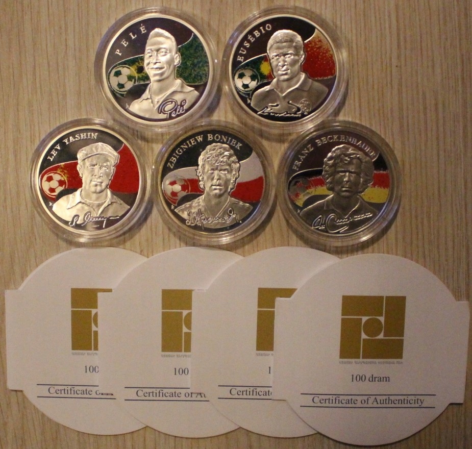 Название PELE EUSEBIO BONIEK YASHIN i BECKENBAUER - 100 DRAM 2008 - 2009 ARMENIA, ZESTAW 5 SZTUK + 4 ORYGINALNE CERTYFIKATY, MENNICZE