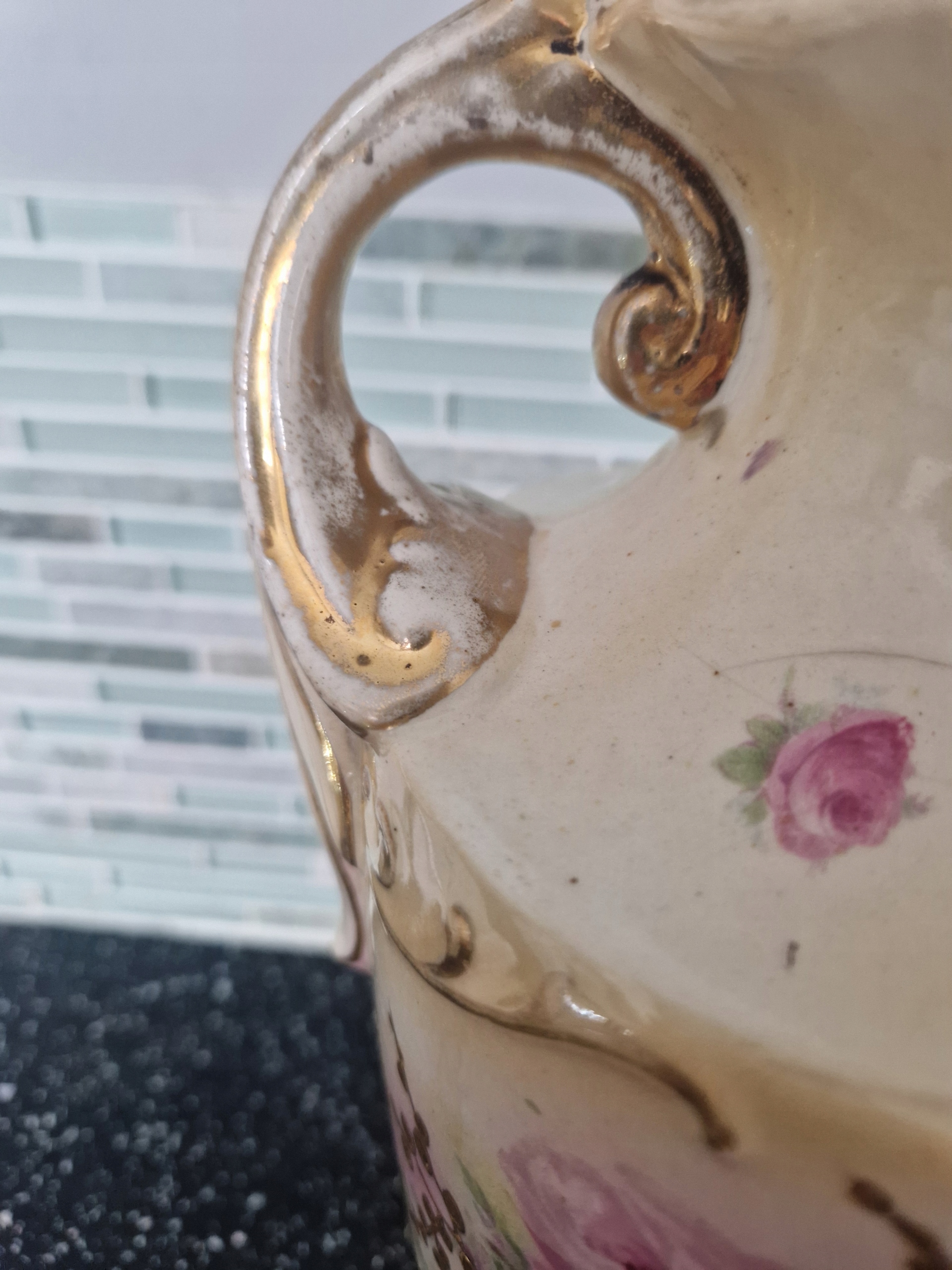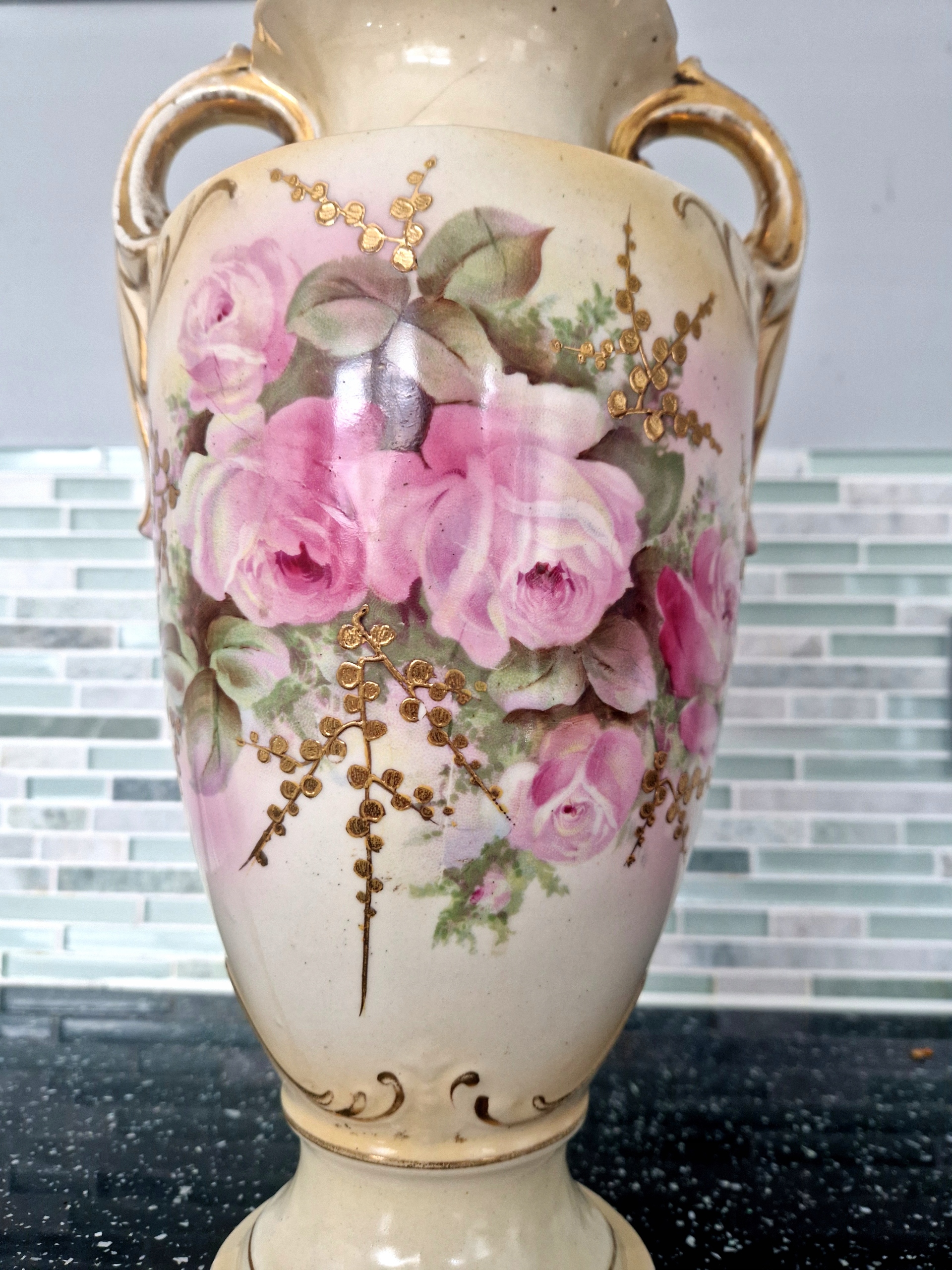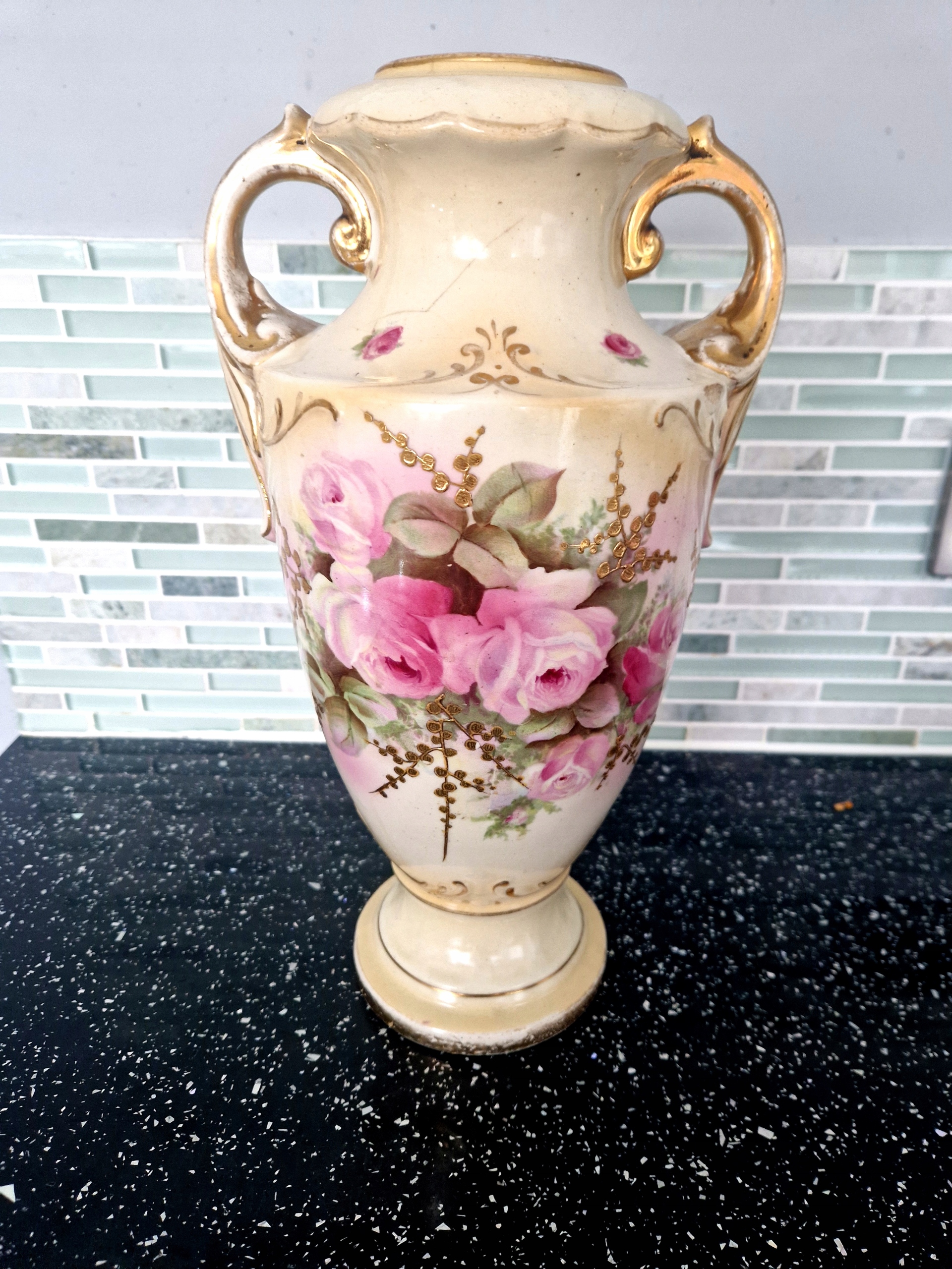 Przedmiotem sprzedaży jest ręcznie zdobiona Angielska AMFORA, pochodzaca z epoki Wiktoriańskiej. Widoczne niedoskonałości takie jak przetarcia złoceń oraz lekkie pęknięcie o grubości włosa. Wysokość 36 cm.