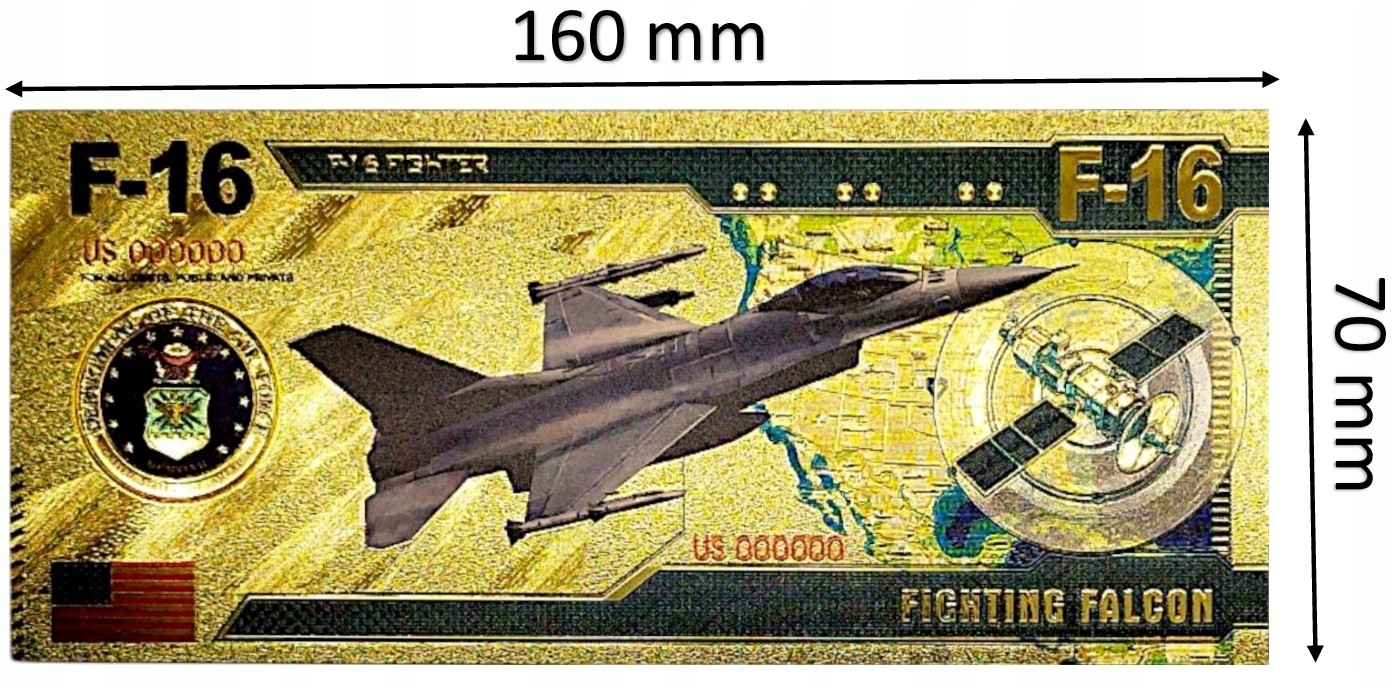 ⭐ Kolekcjonerski banknot wykonany z wysokiej jakości tworzywa PVC, pozłacany, przedstawiający legendarny myśliwiec F-16 Fighting Falcon – jeden z najbardziej rozpoznawalnych i cenionych samolotów bojowych na świecie.