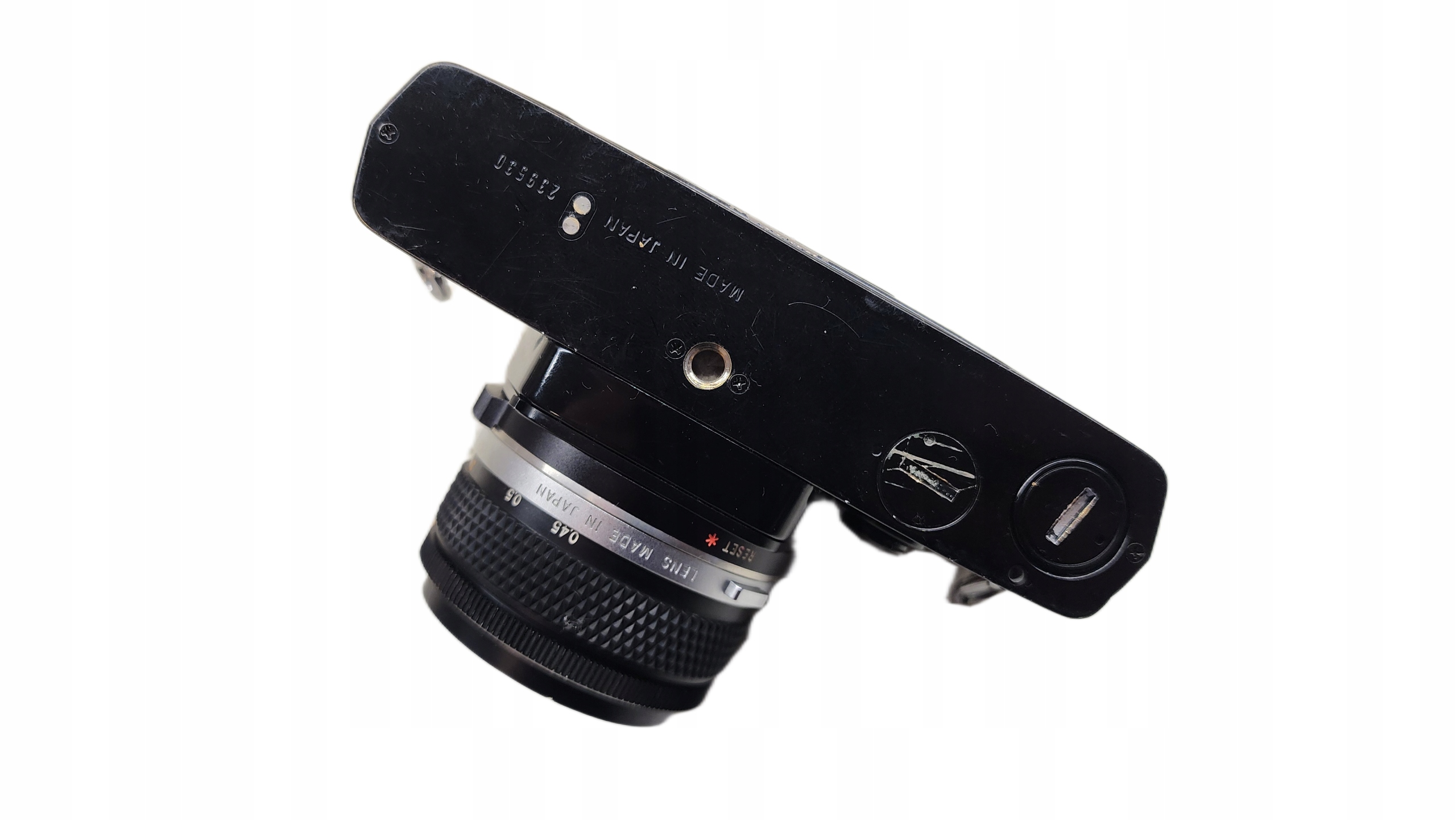Aparat w bardzo dobrej kondycji. Matówka czysta i jasna, jedynie lekka wgniotka na boku obudowy przez co wajcha od naciagu filmu wraca wolniej.