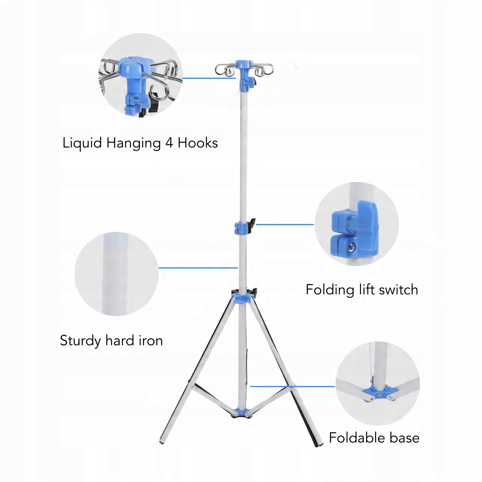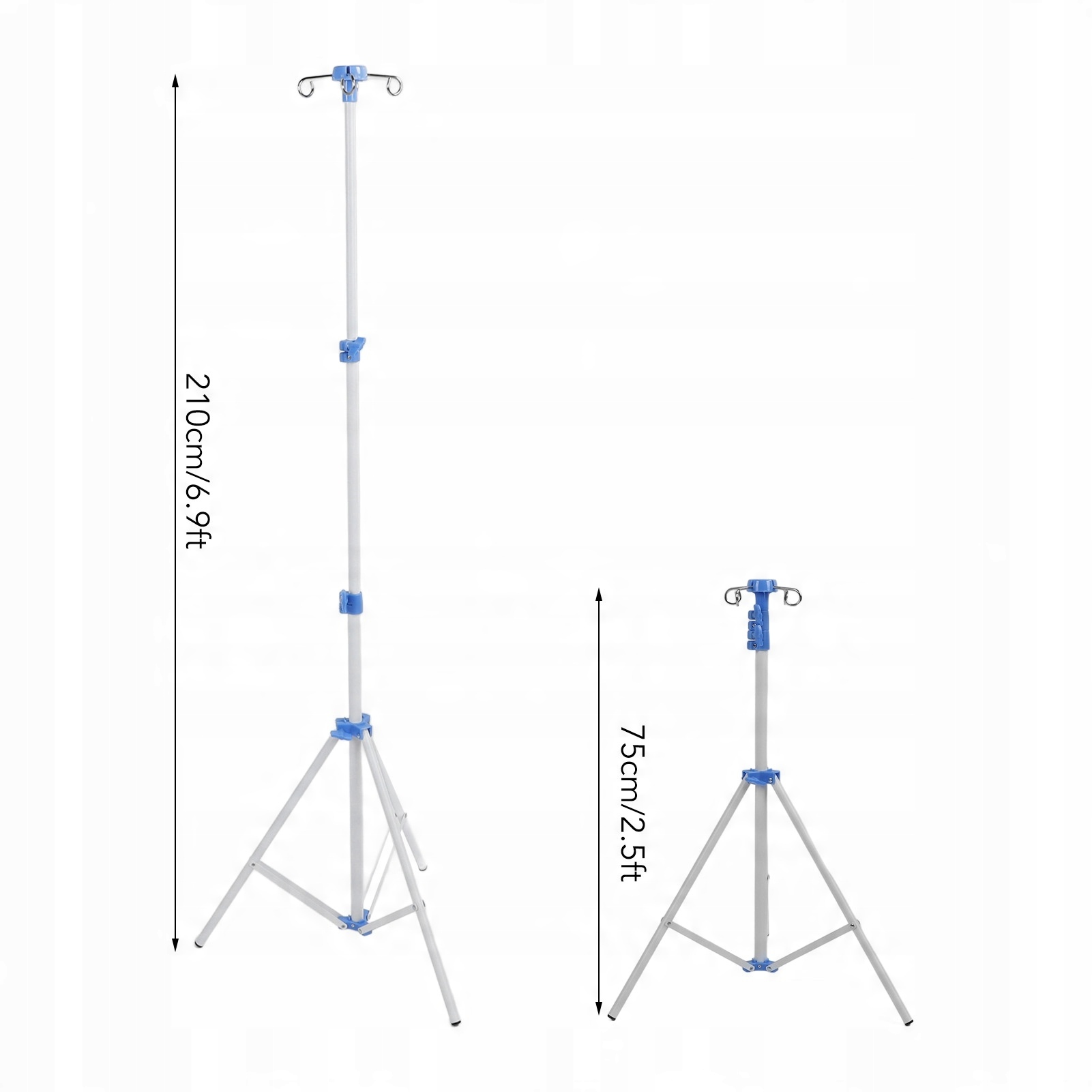 2. Regulowana konstrukcja: stojak na kroplówkę jest regulowany, zakres wysokości 75–210 cm, skadany, atwy w użyciu; 4 haki i 3 nogi, stabilne i niezawodne. Trójnóg zapewnia stabilność, zapobiegając koysaniu się i przewróceniu.