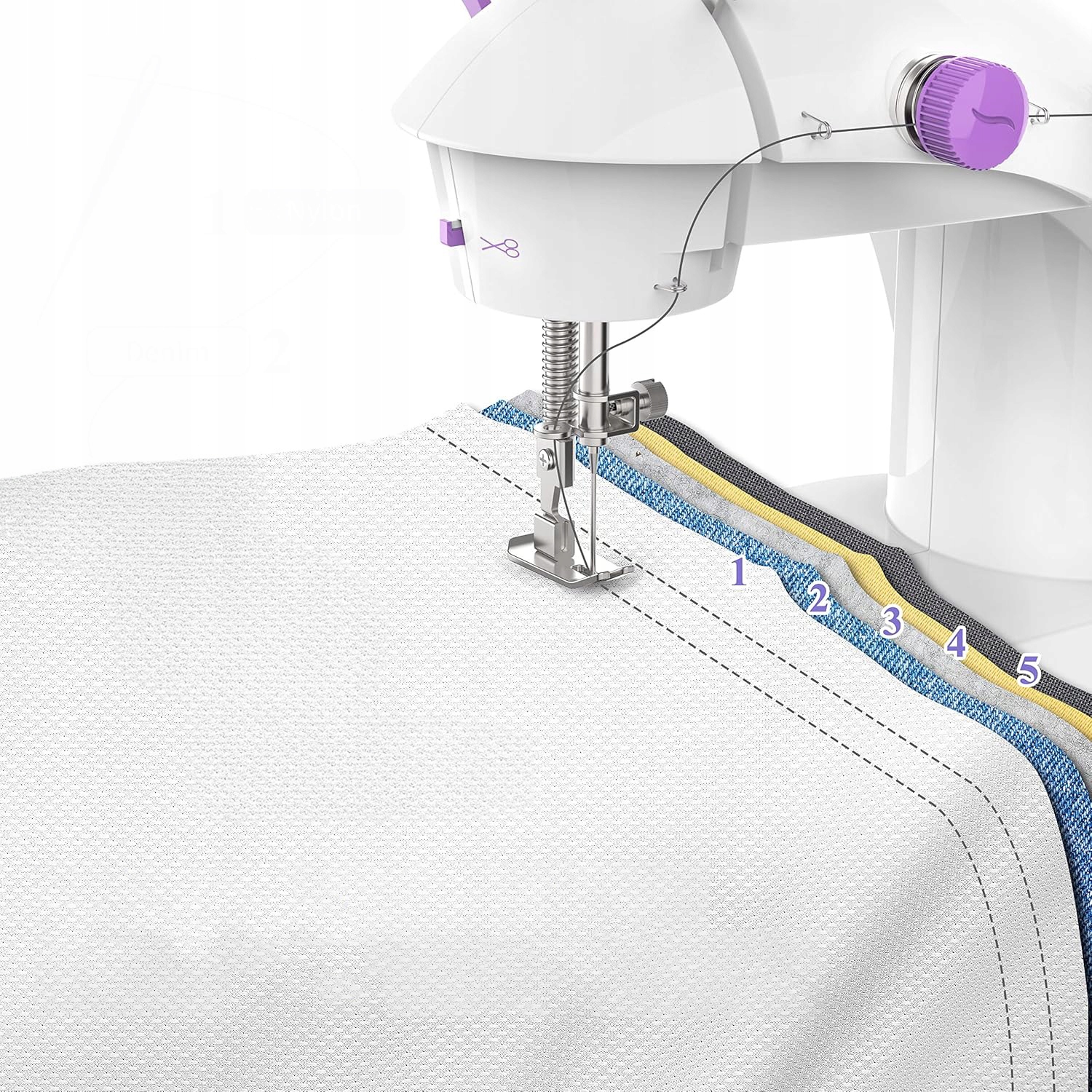 Podwójna nić zapewnia mocniejsze ściegi i łatwiejsze kończenie szycia, bez konieczności wiązania nici. Na urządzeniu znajduje się przycisk regulacji prędkości, który umożliwia regulację prędkości (wysokiej lub niskiej) w zależności od potrzeb.