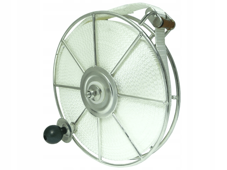 Kołowrotek wykonany ze stali nierdzewnej ze wzmacnianą taśmą o długości 30 metrów.