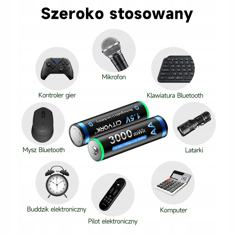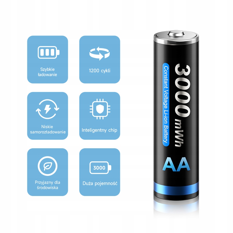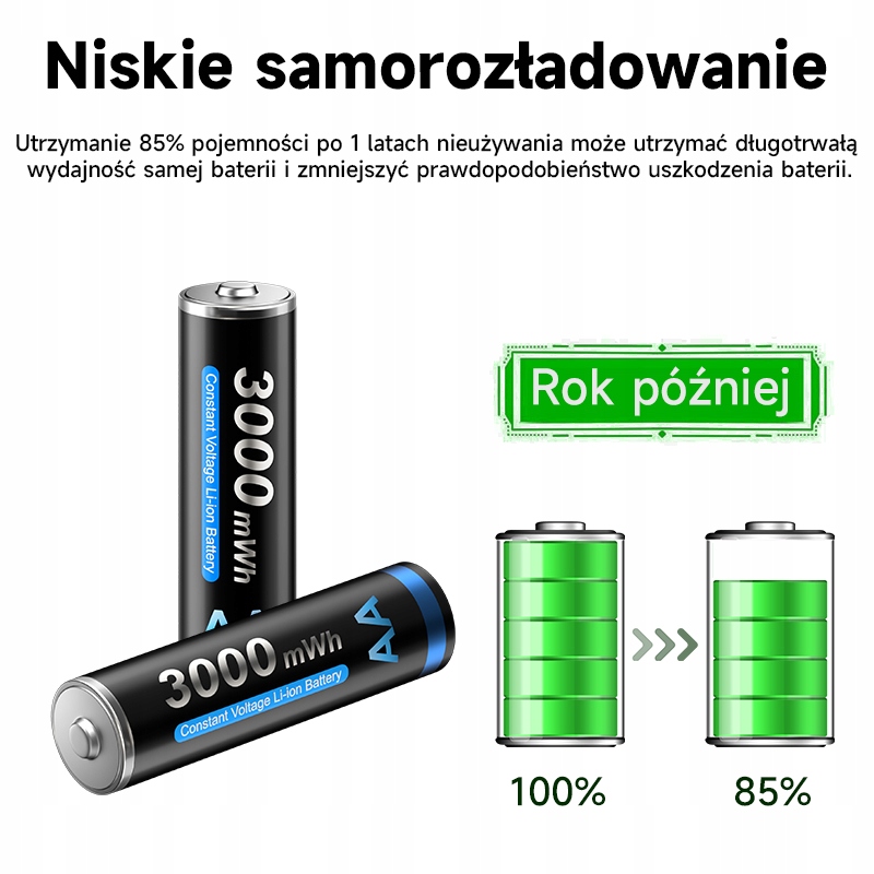 Uwaga: Akumulatory te można ładować tylko za pomocą dedykowanej ładowarki 1.5 V i nie można ich ładować za pomocą akumulatora wodorowego / niklowego kadmu niklowego 1.2 V lub ładowarki baterii litowej 3.7 V