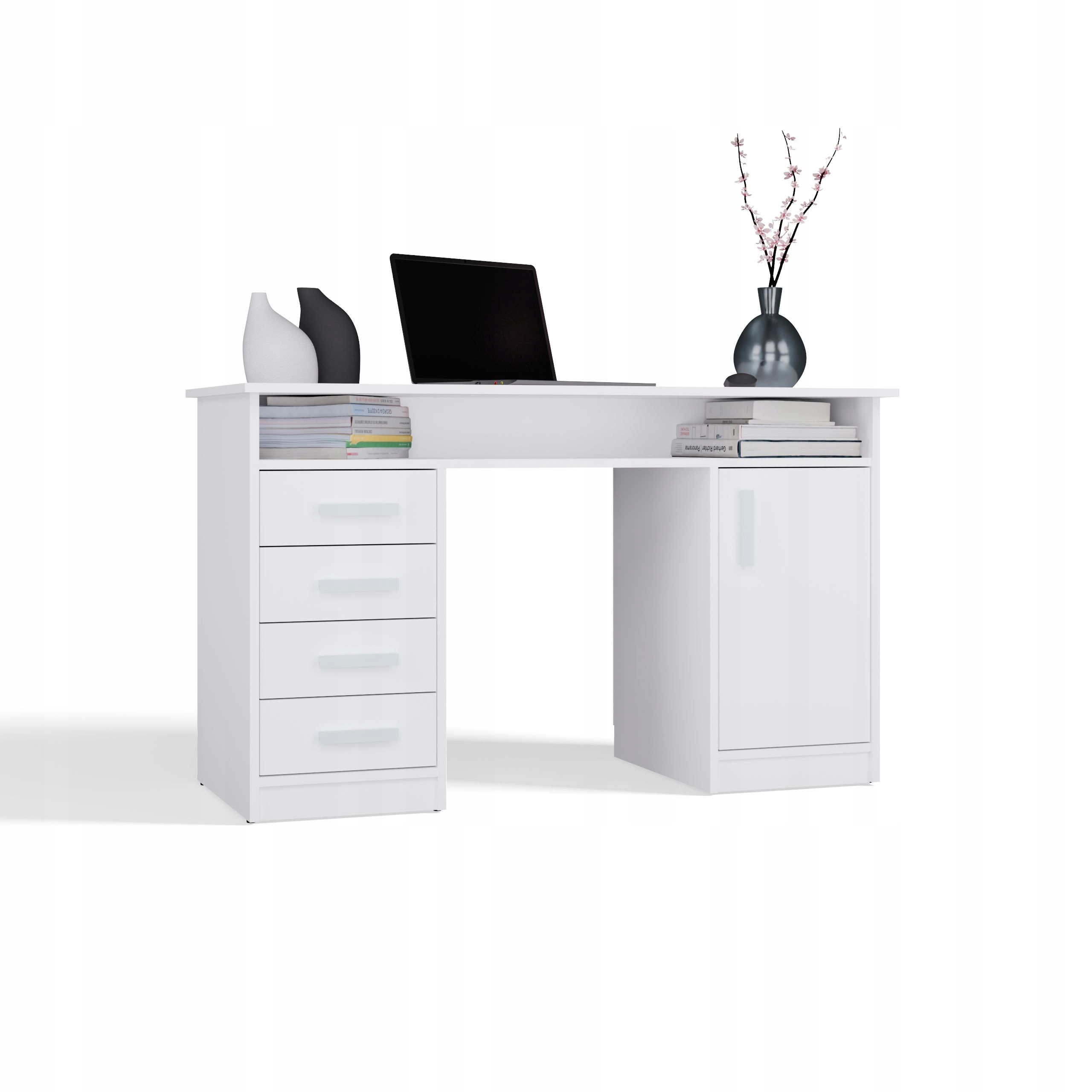 Wyposażone w 4 szuflady oraz zamykany 1 drzwiami schowek z 2 półkami, zapewnia dużo miejsca do przechowywania dokumentów, książek czy akcesoriów biurowych. Dodatkowa otwarta półka pod blatem idealnie sprawdzi się na drobne przedmioty, laptopa czy zeszyty.