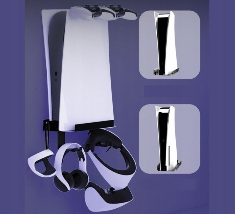 Uchwyt ścienny pozwala graczom utrzymać porządek i lepiej zorganizować przestrzeń w salonie lub pokoju gamingowym. Konsola oraz akcesoria – kontrolery, słuchawki czy gogle VR – mają swoje stałe miejsce, dzięki czemu nie leżą luzem, nie plączą się kable i całość wygląda estetycznie oraz nowocześnie.