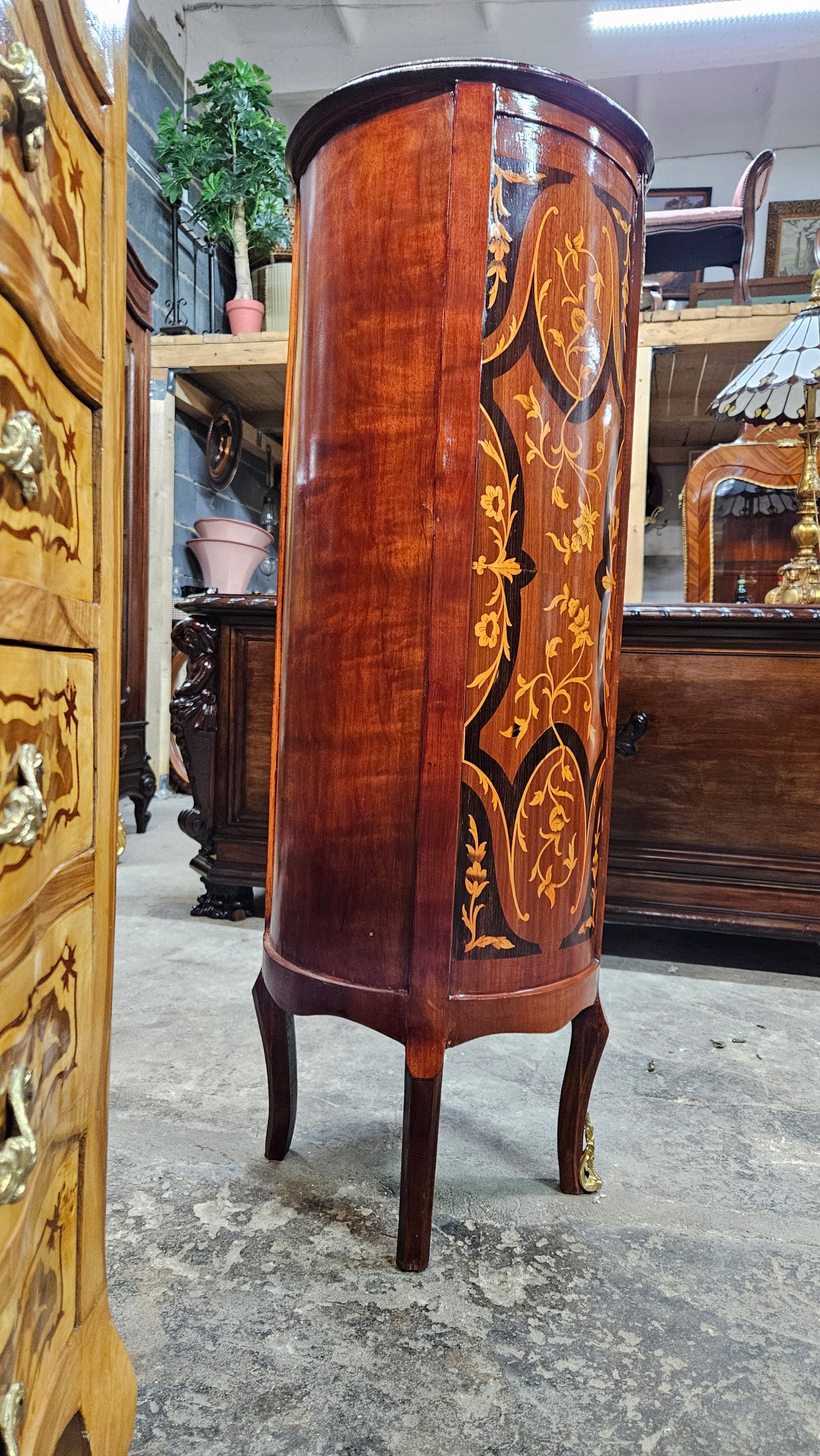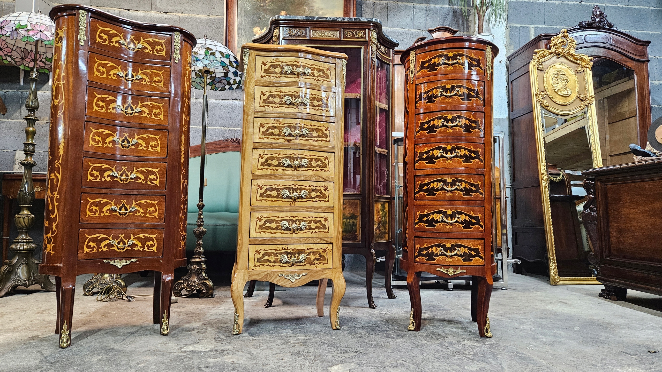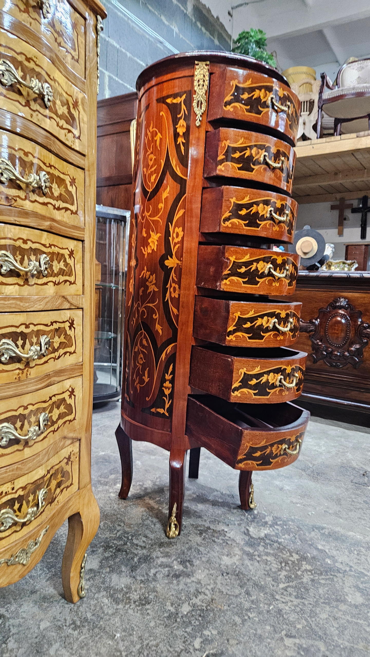 Wykonany z Drewna fornirowana Intarsja , bez kornika bez Luzu, - Stabilna. Szufladki siedem sztuk. , nogi gięte .Dodatki mosiądz .