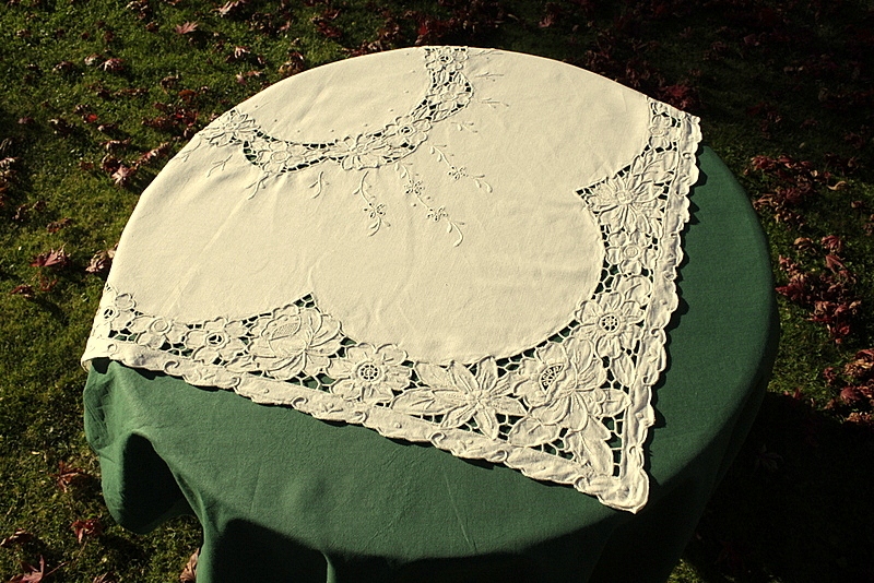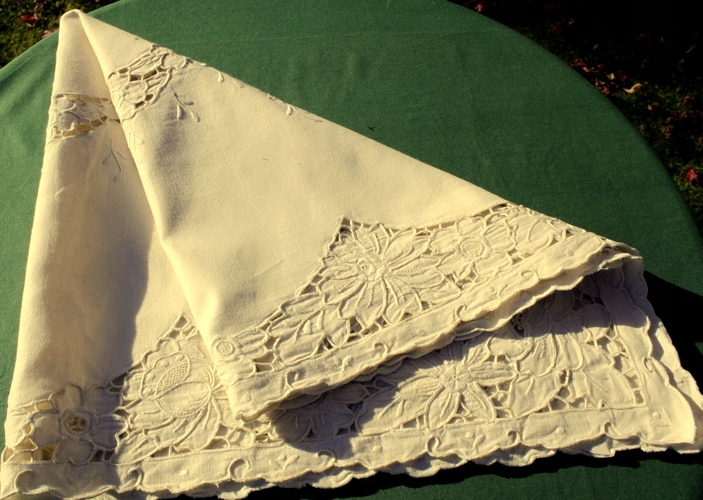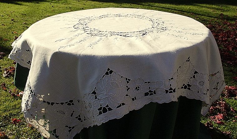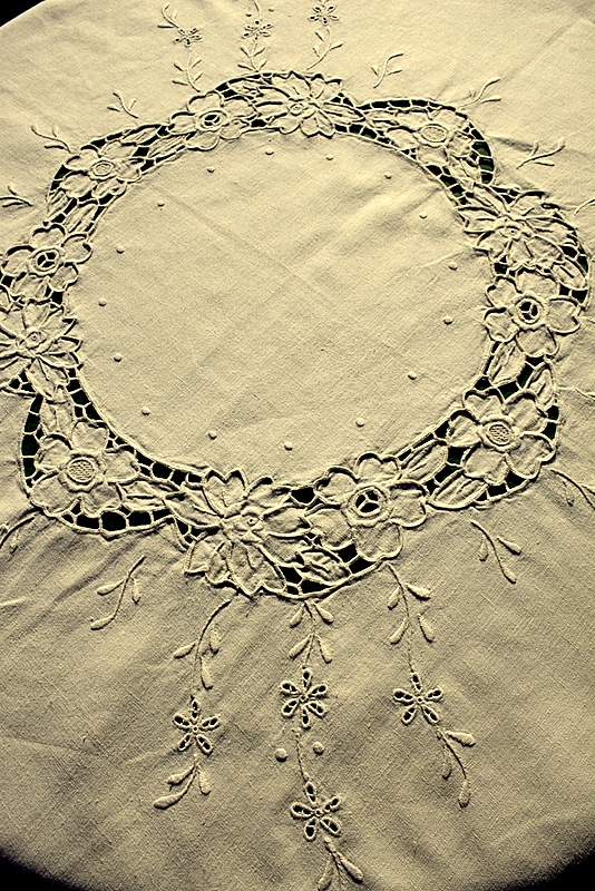 Przepięknie, niezwykle misternie wykonany obrus z cienkiej tkaniny lnianej ozdobiony klasycznym haftem richelieu. Obrusy w tym stylu posiadają niepowtarzalny urok dzięki róznorodnym motywom roślinnym o ciekawych formach i azurowych przęstkach wraz z pajęczkami tworząc misterną ażurową koronkę, okazale wykończone narożniki obrusa.Całośc tkanina i haft przepięknie ze sobą współgrają w kolorze ciepłego ecru.