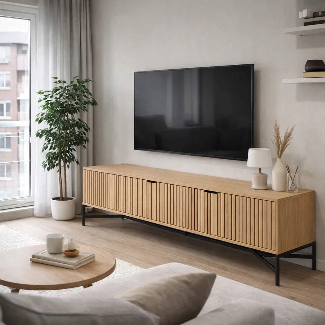 Szafka RTV Lamel Loft Oak to połączenie naturalnego ciepła dębu z surowym, loftowym charakterem stali. Fronty z pionowymi lamelami nadają bryle nowoczesny rytm i elegancję, a prosta forma doskonale wpisuje się zarówno w industrialne, jak i nowoczesne wnętrza. Szafka RTV posiada troje drzwiczek, za którymi znajduje się otwarta przegroda, zapewniająca wygodne przechowywanie.
