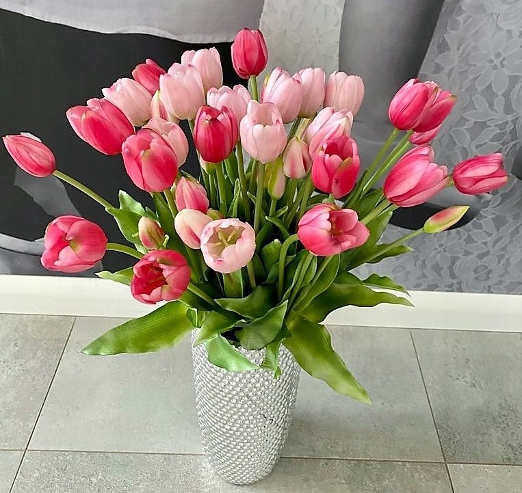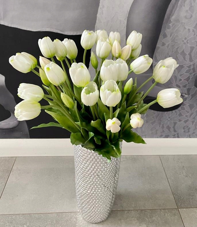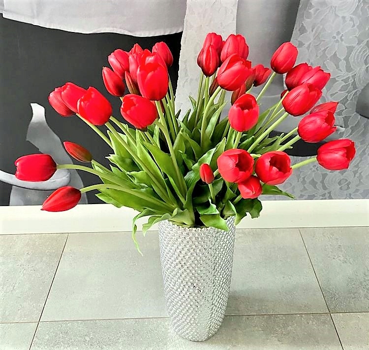 Silikonowe tulipany wyglądają praktycznie jak żywe, właśnie dlatego najlepiej wykorzystać je po prostu jako dekorację. Są bardzo przyjemne w dotyku. Przepięknie będą wyglądać w szklanym wazonie, postawionym na środku komody, stołu lub na parapecie. Ich największą zaletą jest odporność na uszkodzenia. Dodatkowo nie wymagają praktycznie żadnej pielęgnacji. Aby podkreślić ich autentyczność, do szklanego naczynia można wlać wody. Z kwiatami nic się nie stanie, a tulipany będą wyglądać jak świeżo zerwane