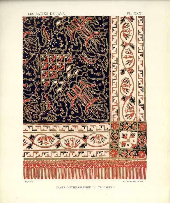 Tablice pokazują elementy stroju Jawajczyków, kostiumologia. Większość obiektów ze zbiorów Musée d'Ethnographie du Trocadéro w Paryżu (obecnie Musée de l'Homme), nadto ze zbiorów prywatnych i innych zbiorów muzealnych. Tablice w światłodruku, efektowne tablice barwne z dodatkiem koloru kładzionego szablonem (pochoir). Tablice barwne to: 2, 7, 12, 17, 22, 26, 31, 36, 41. Tablica nr 42-43 podwójna, ostatnia tablica bez numeru reklamowa: Le Batik Français. Madame Marguerite Pangon [...] Paris.