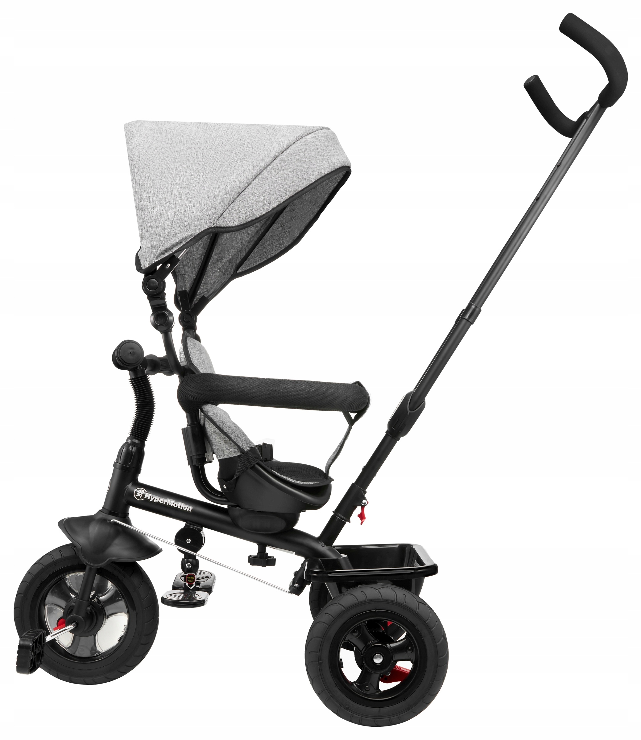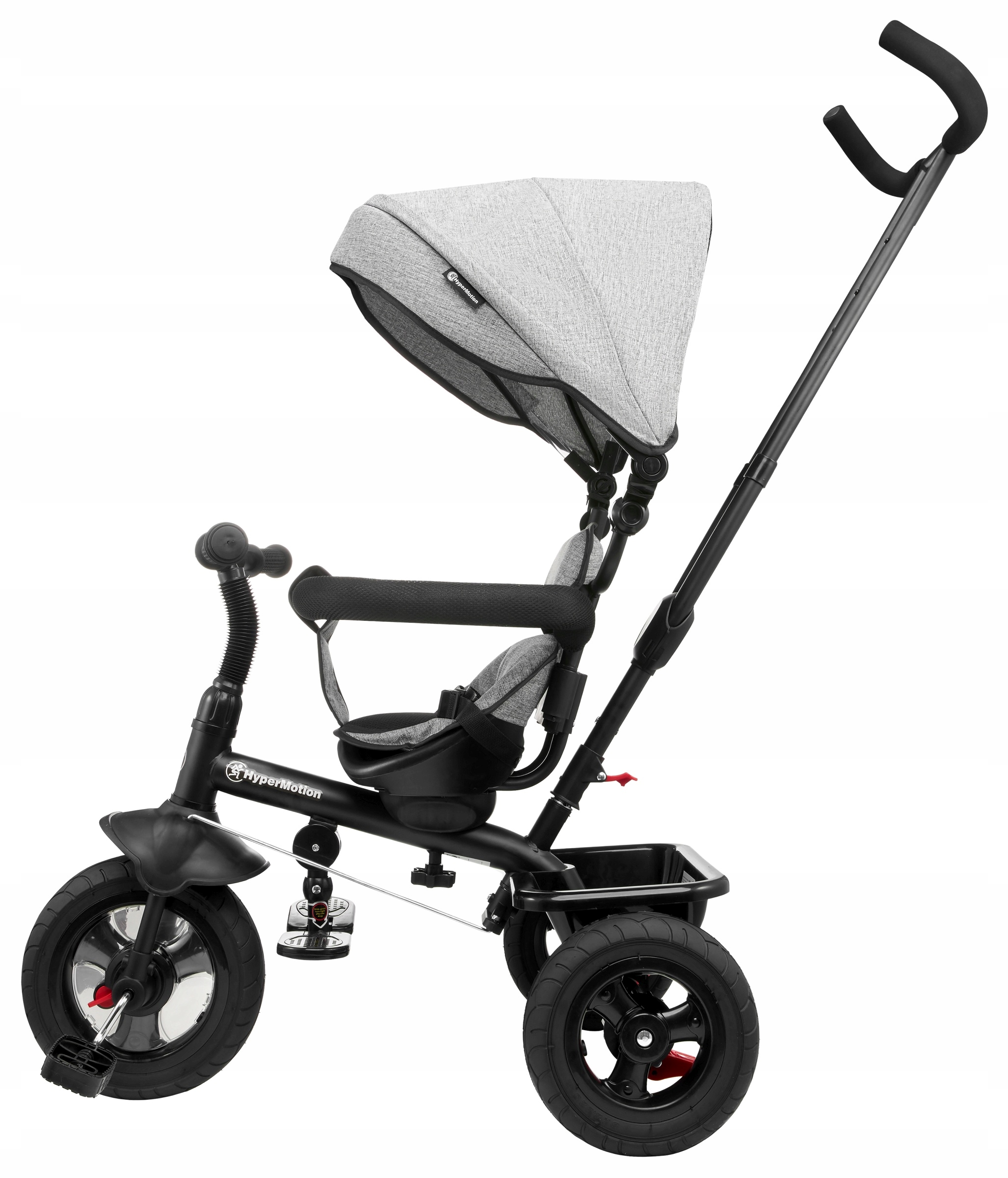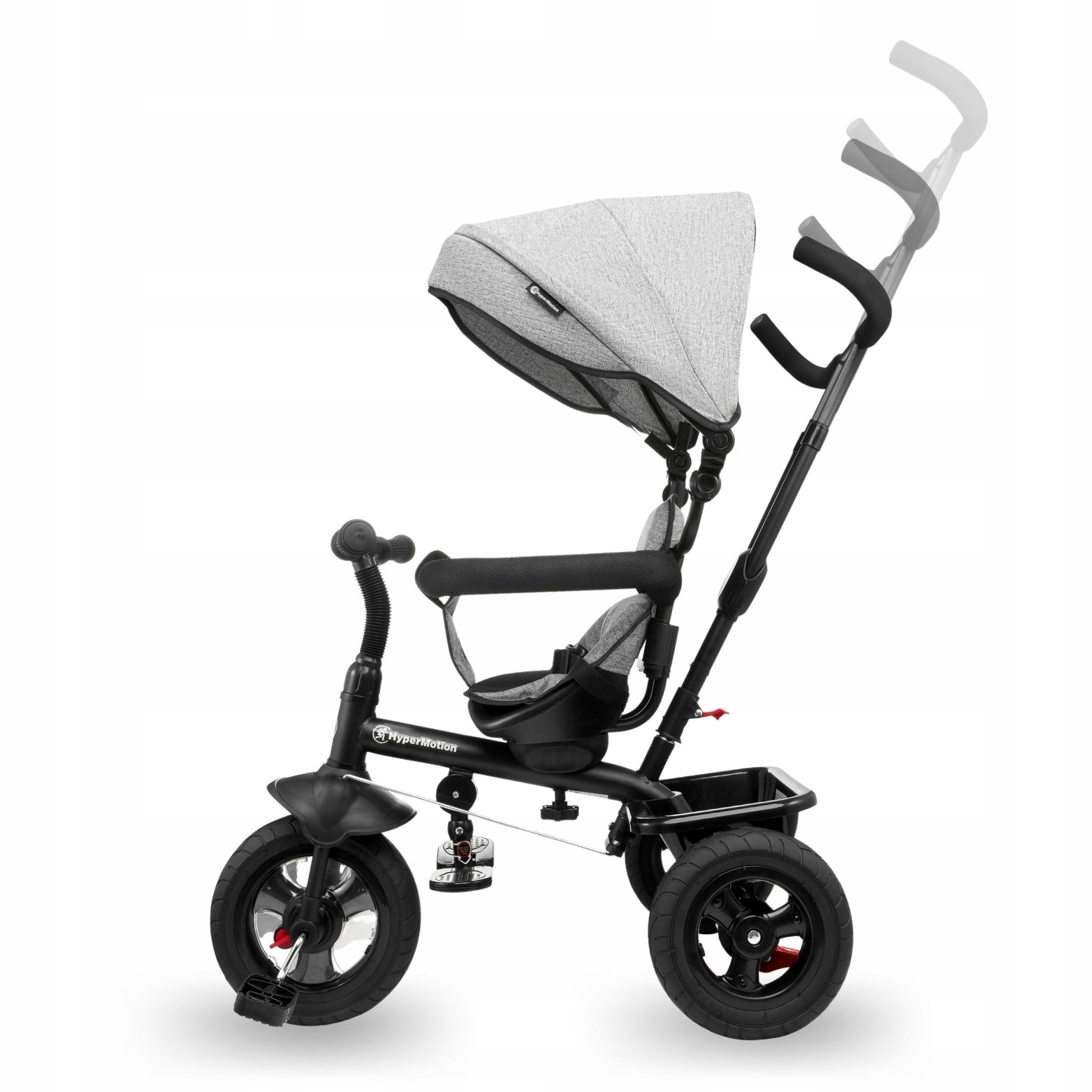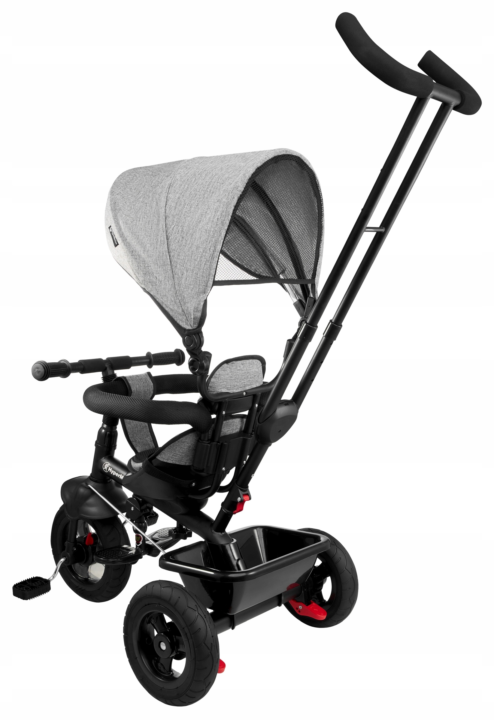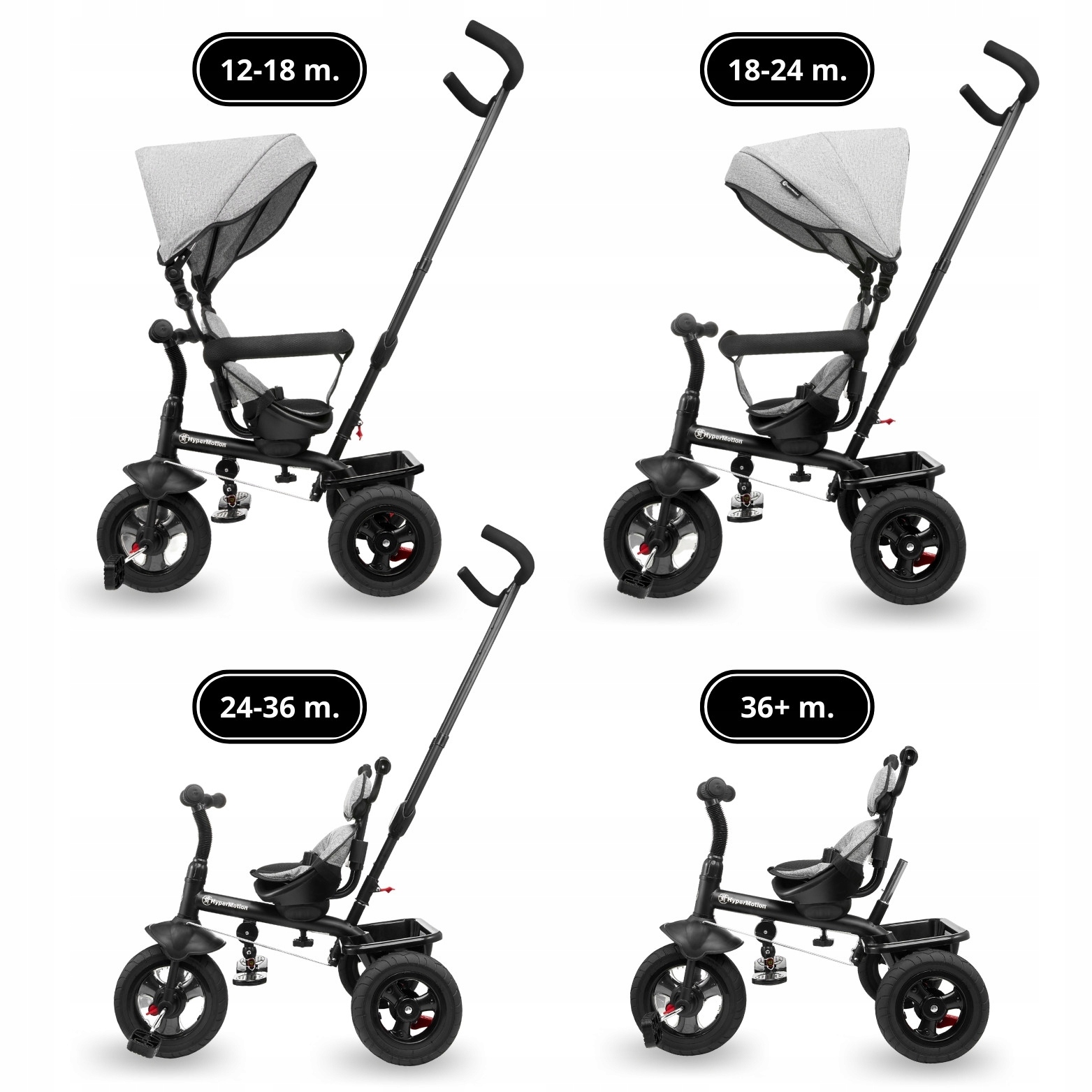 Rowerek można dowolnie przekształcać demontując poszczególne elementy (konstrukcję daszku, drążek kierowniczy, obejmę, podnóżki) tak by finalnie stał się samodzielnym rowerkiem trójkołowym.