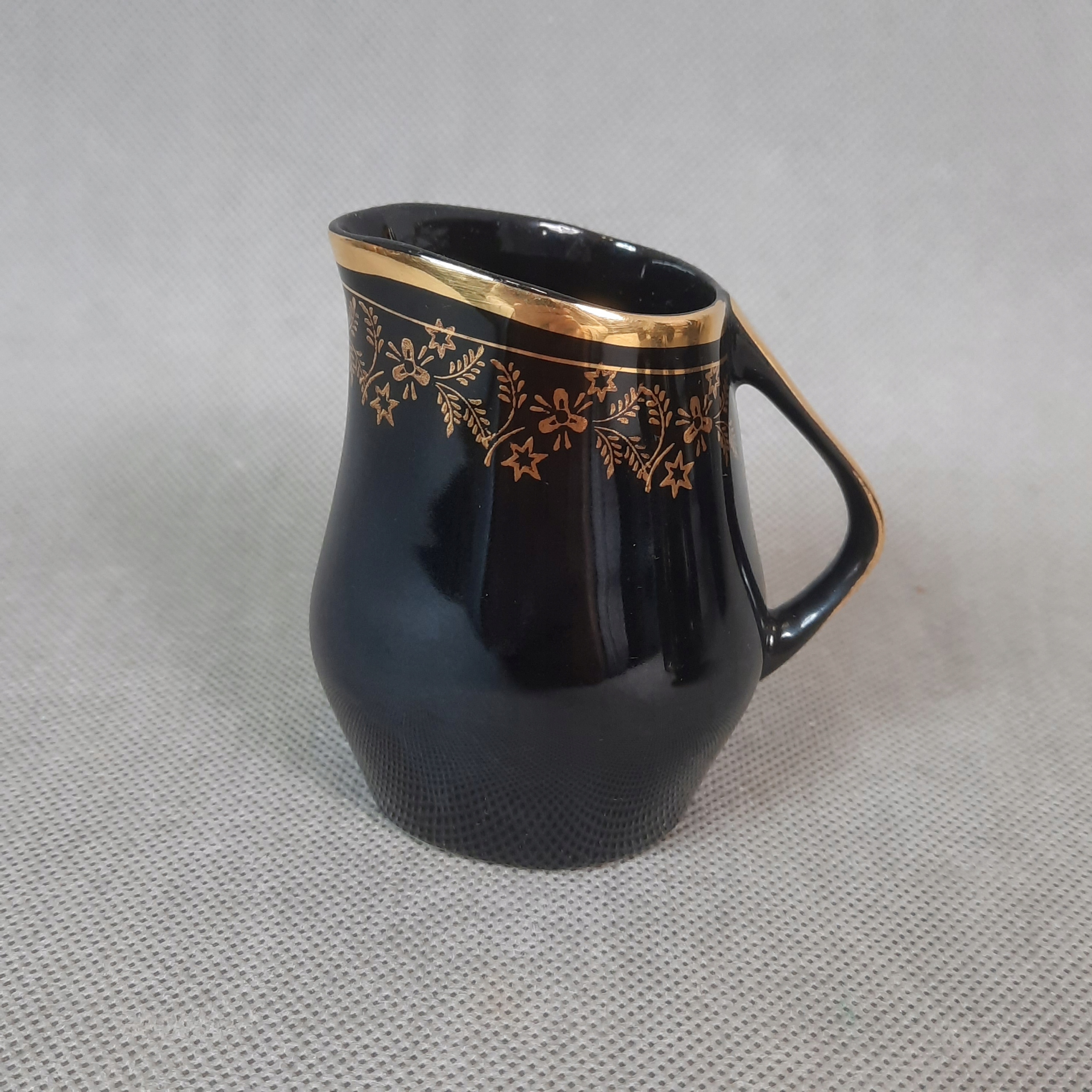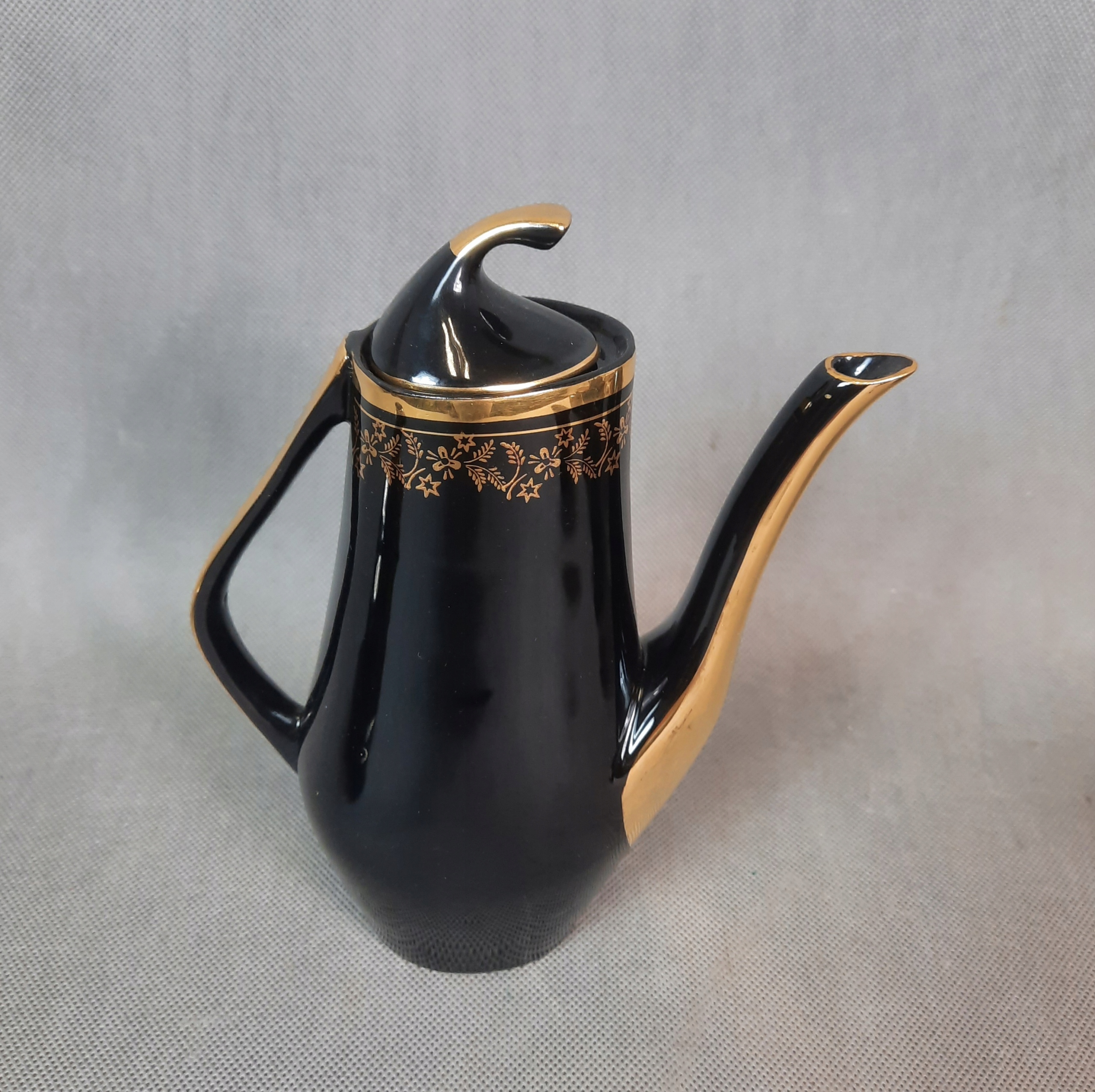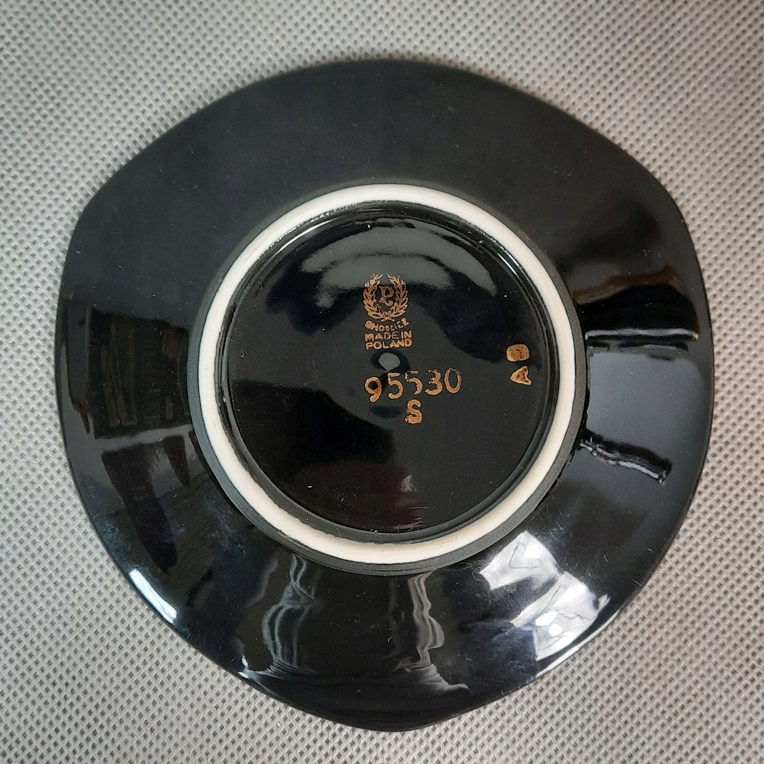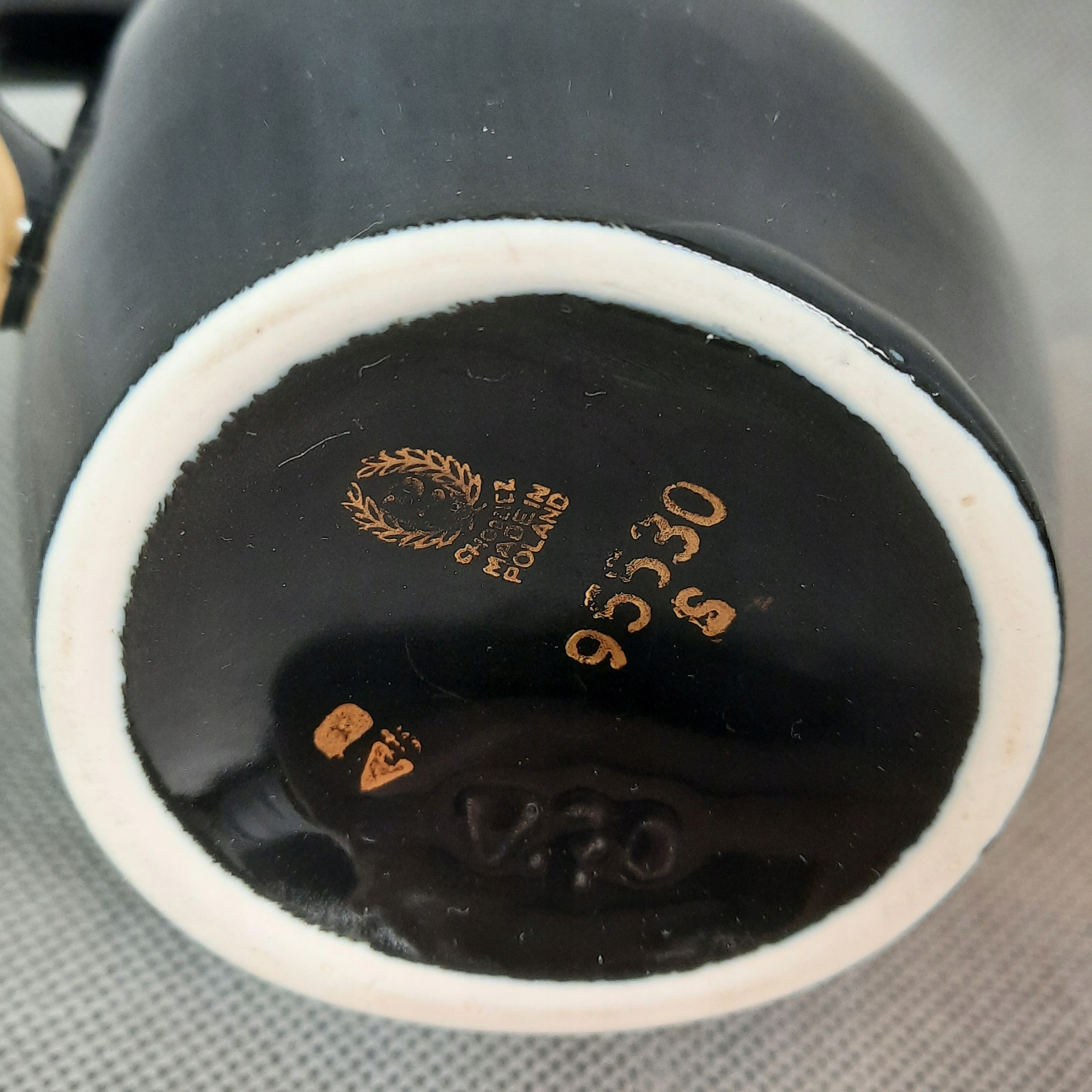 Serwis kawowy czarny CHODZIEŻ , ręcznie malowane złocenia - w komplecie 6szt filiżanek, 6szt talerzy, 1szt mlecznik, 1szt cukierniczka, 1szt dzbanek
