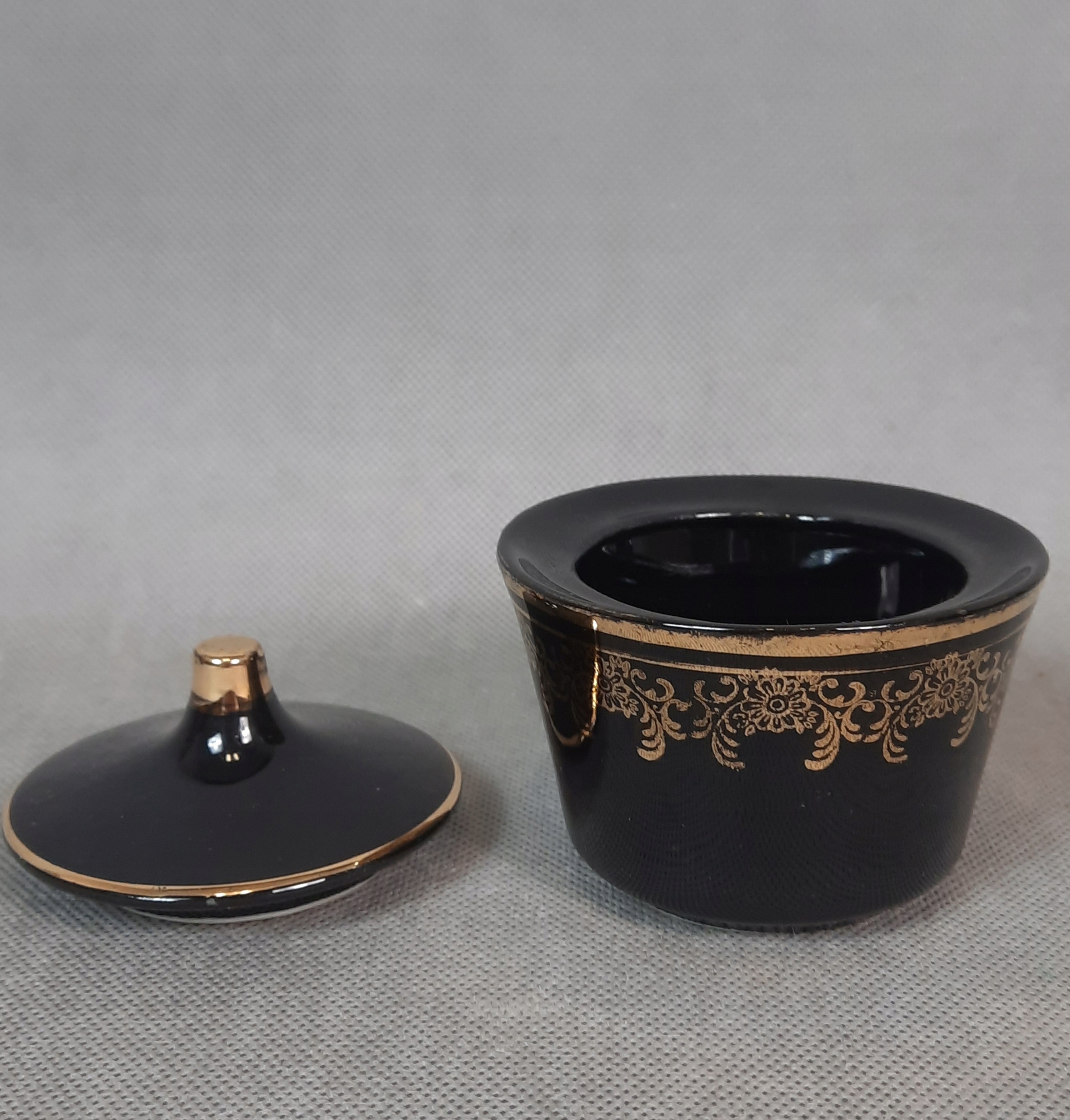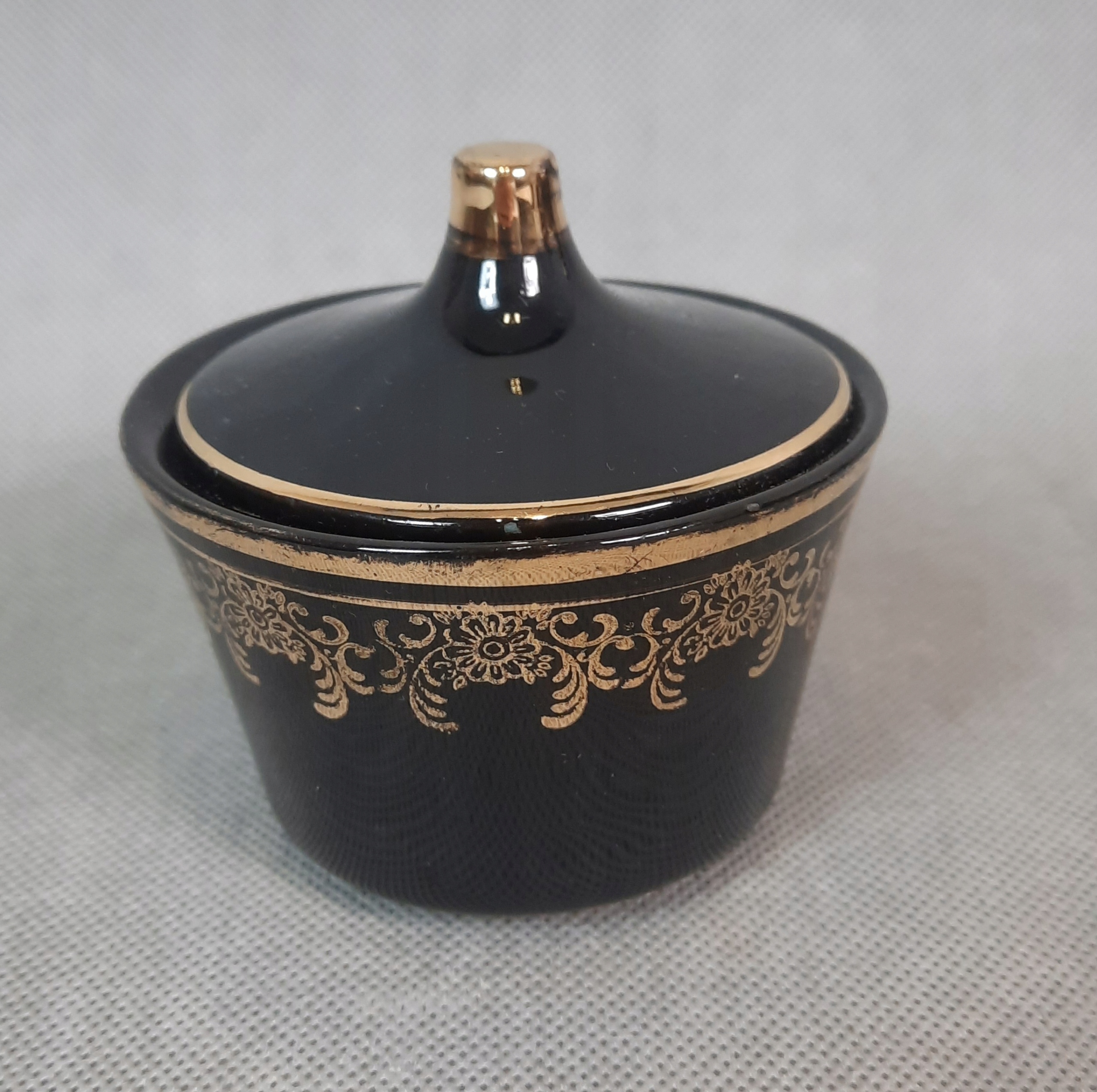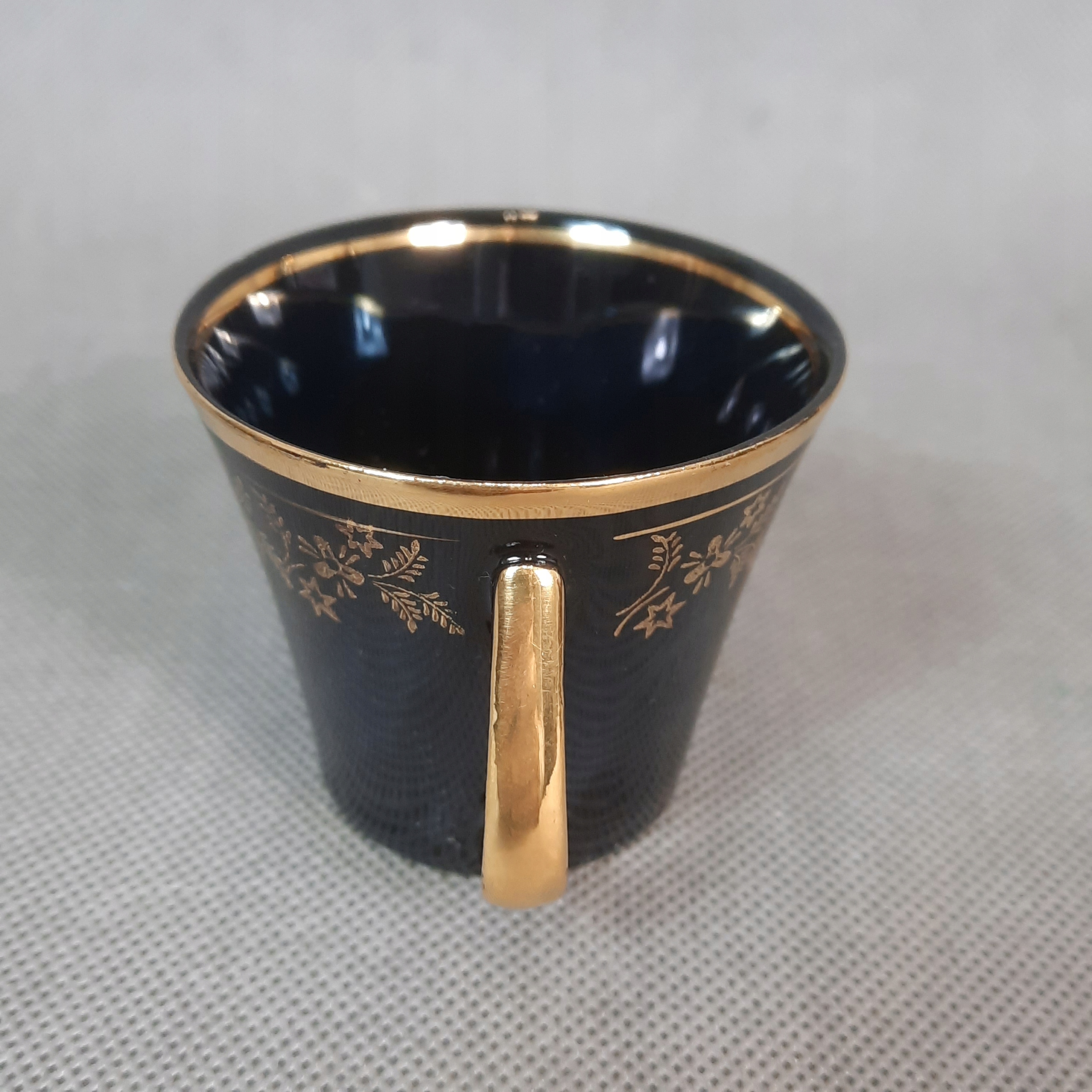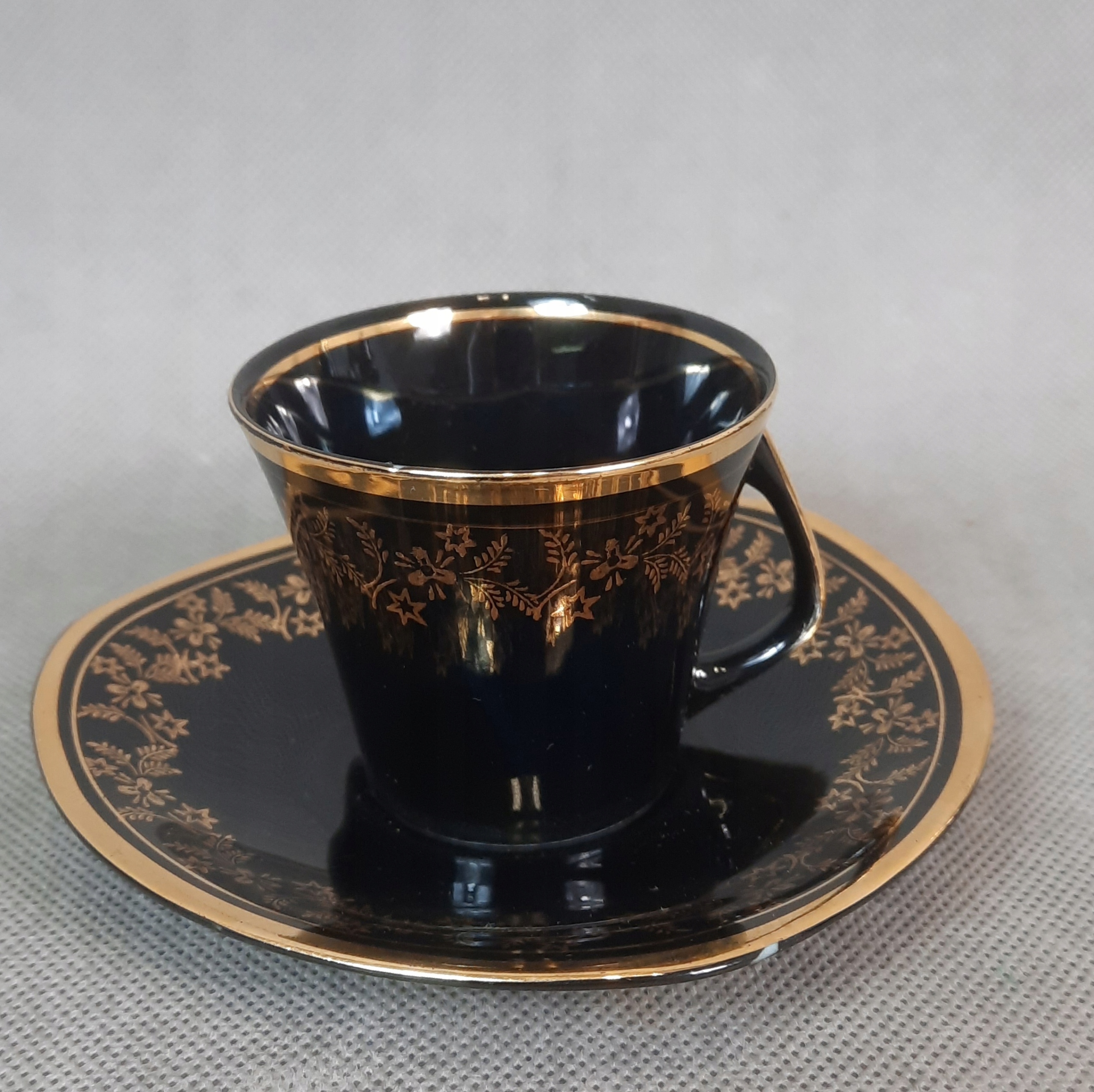 Serwis kawowy czarny CHODZIEŻ , ręcznie malowane złocenia - w komplecie 6szt filiżanek, 6szt talerzy, 1szt mlecznik, 1szt cukierniczka, 1szt dzbanek