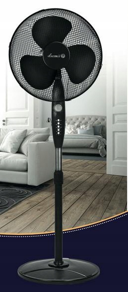 Wentylator stojący o mocy 45 W, 3 ustawienia prędkości i 2 tryby pracy mieszanej, elektroniczny timer do 7.5 godziny, średnica 40 cm, stabilna podstawa, regulacja wysokości do 130 cm oraz kąta nachylenia, sterowanie po przez pilota.