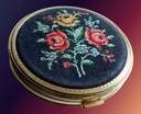 Przedmiot aukcji to puderniczka widoczna na foto. Została przywieziona z Niemiec - kupiona na trodelhalle dla kolekcjonerów. Wykonano ją z mosiądzu. Wierzch zdobi haft petit na czarnym materiale. Puder zabezpiecza folia, ale raczej nie nadaje się do użytku. Stan jak na foto - bdb.