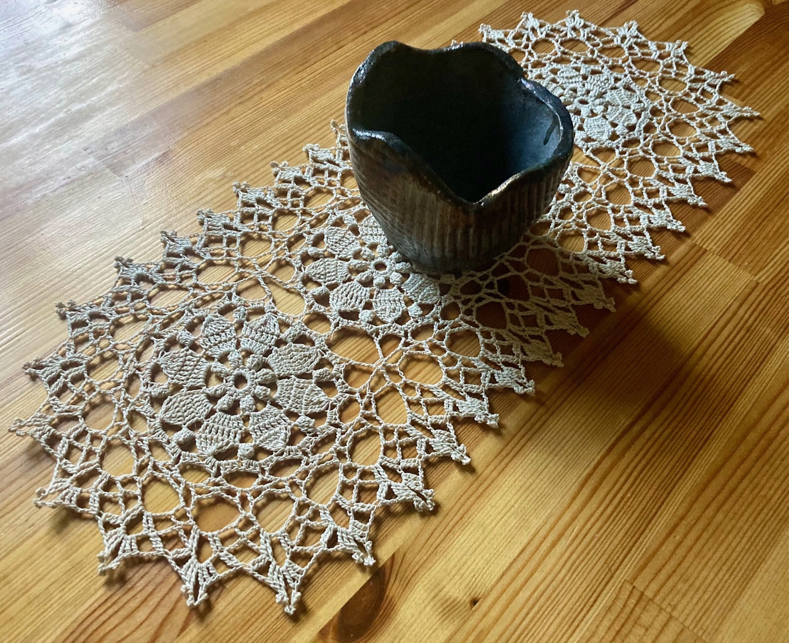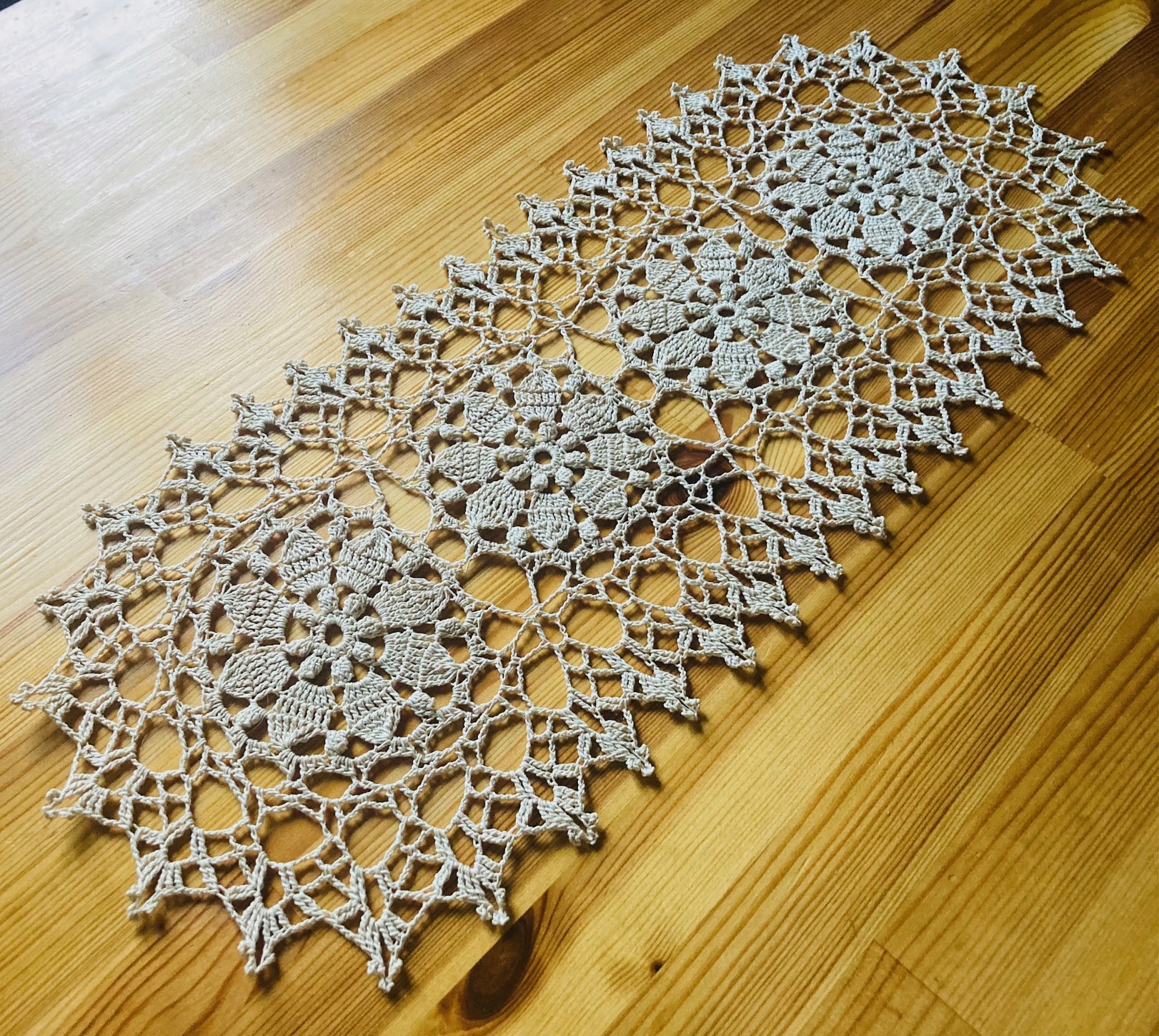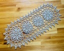 Ręcznie zrobiony na szydełku elegancki bieżnik w delikatnym, jasnym odcieniu beżu.