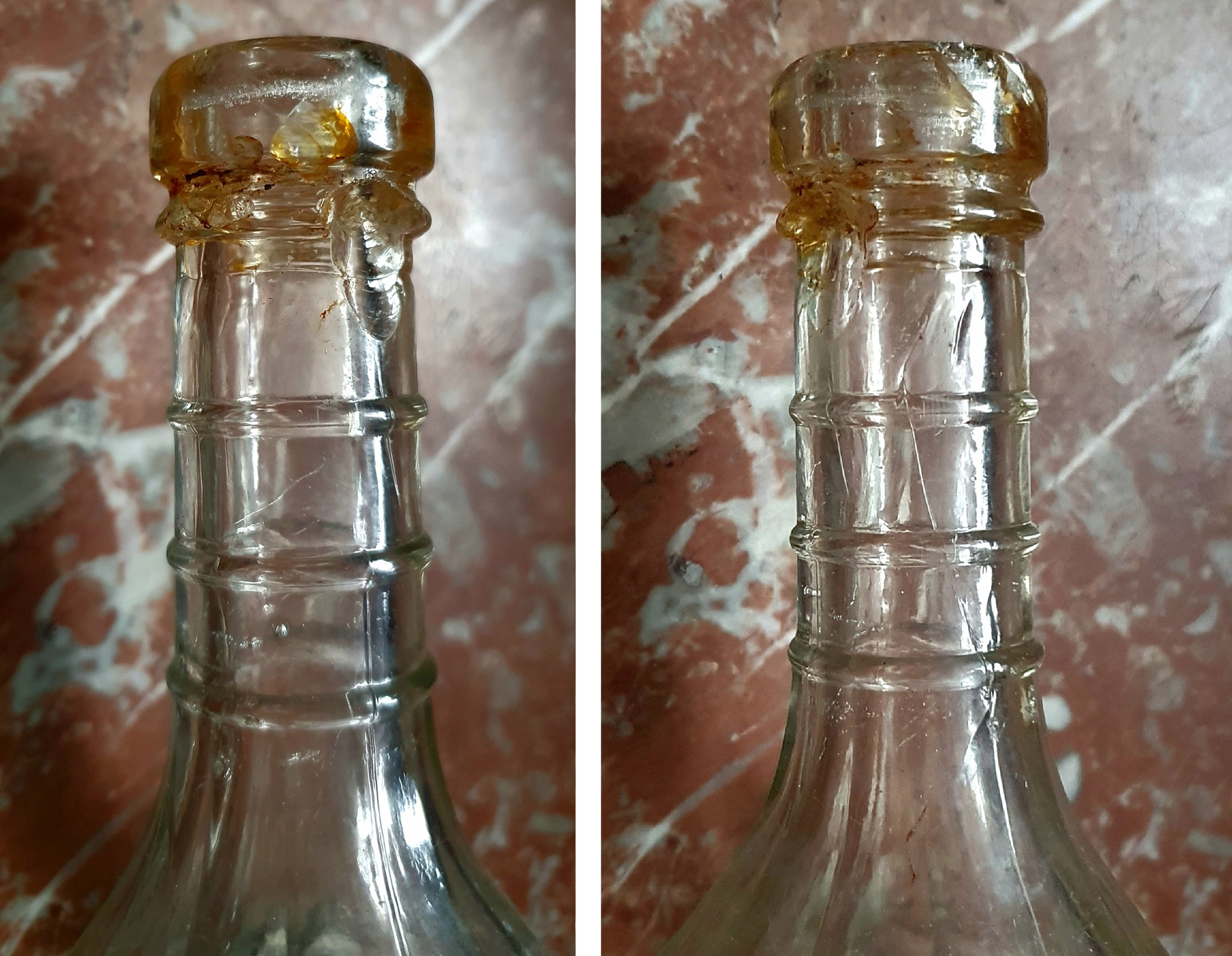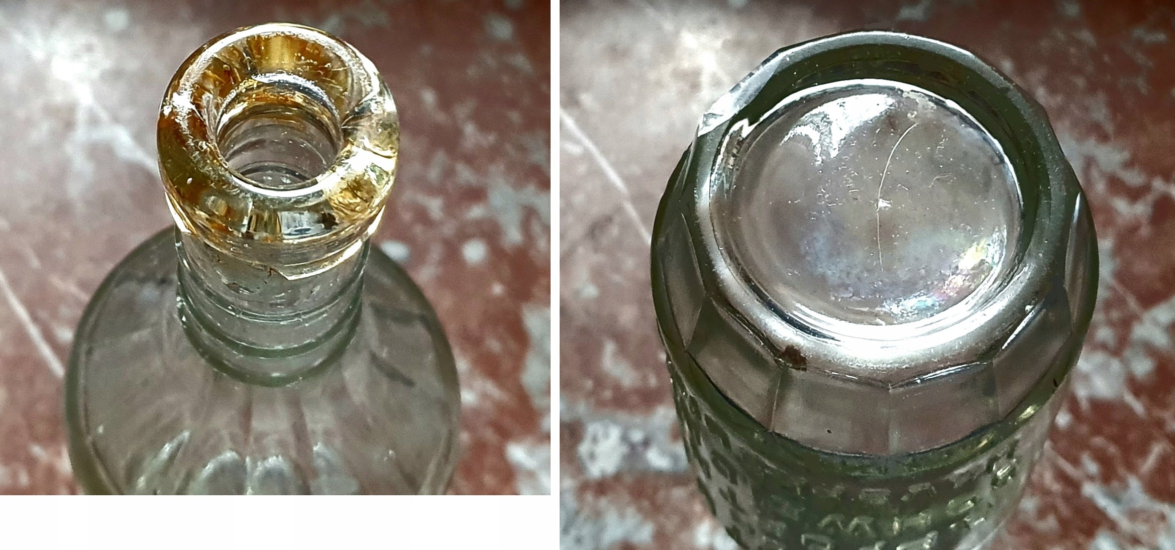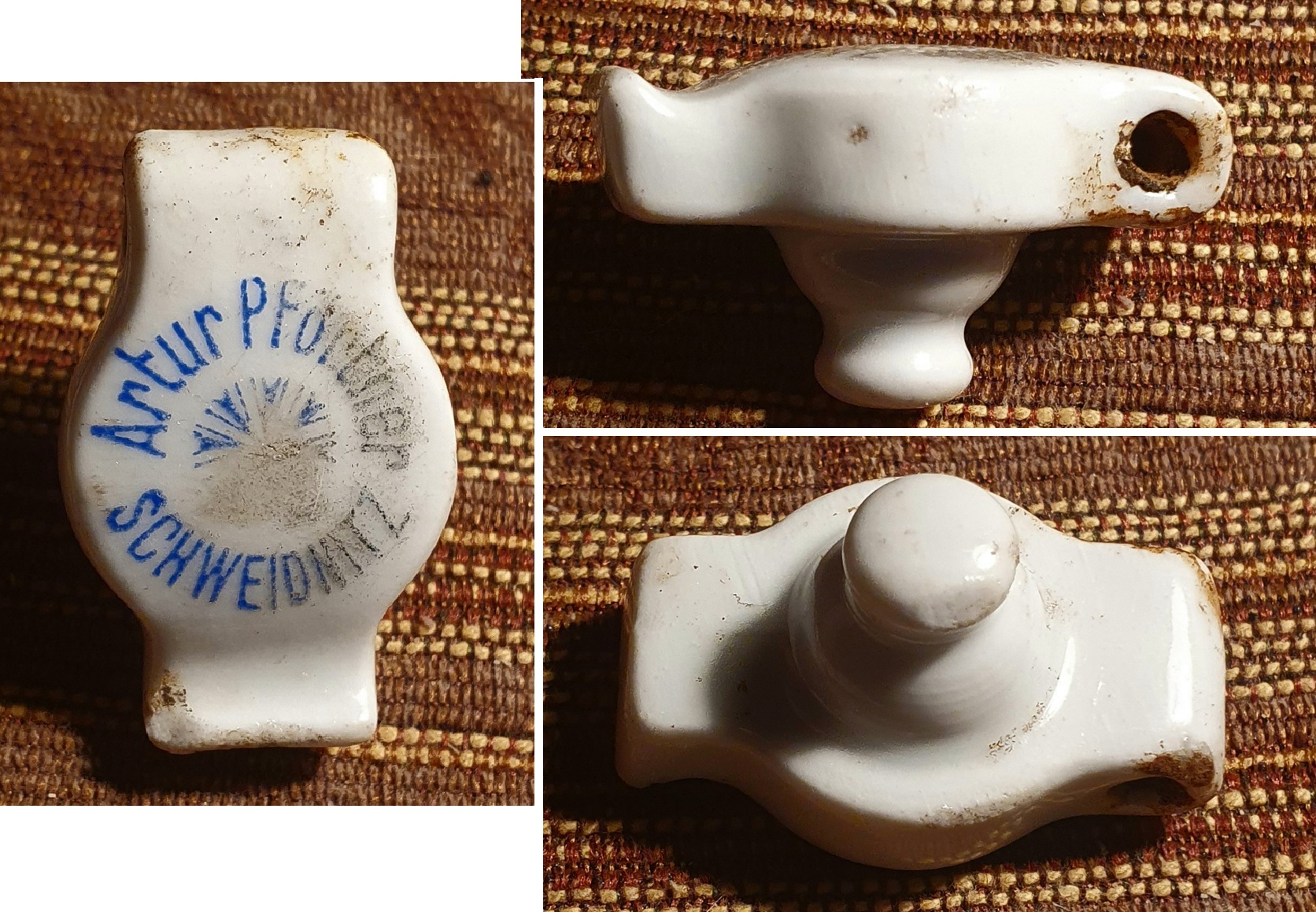 butelka - Świdnica- Schweidnitz - A. Pfortner, szkło białe, stylizowana forma, jak widać na zdjęciach są dwa odpryski w miejscu mocowania drutu od porcelanki i widać też pęknięcie wewnętrzne szkła po lewej stronie napisu , u góry , o długości ok. 5 cm. po za tym butelka w ładnym stanie, oryginalna porcelanka, poj. 0.33L.