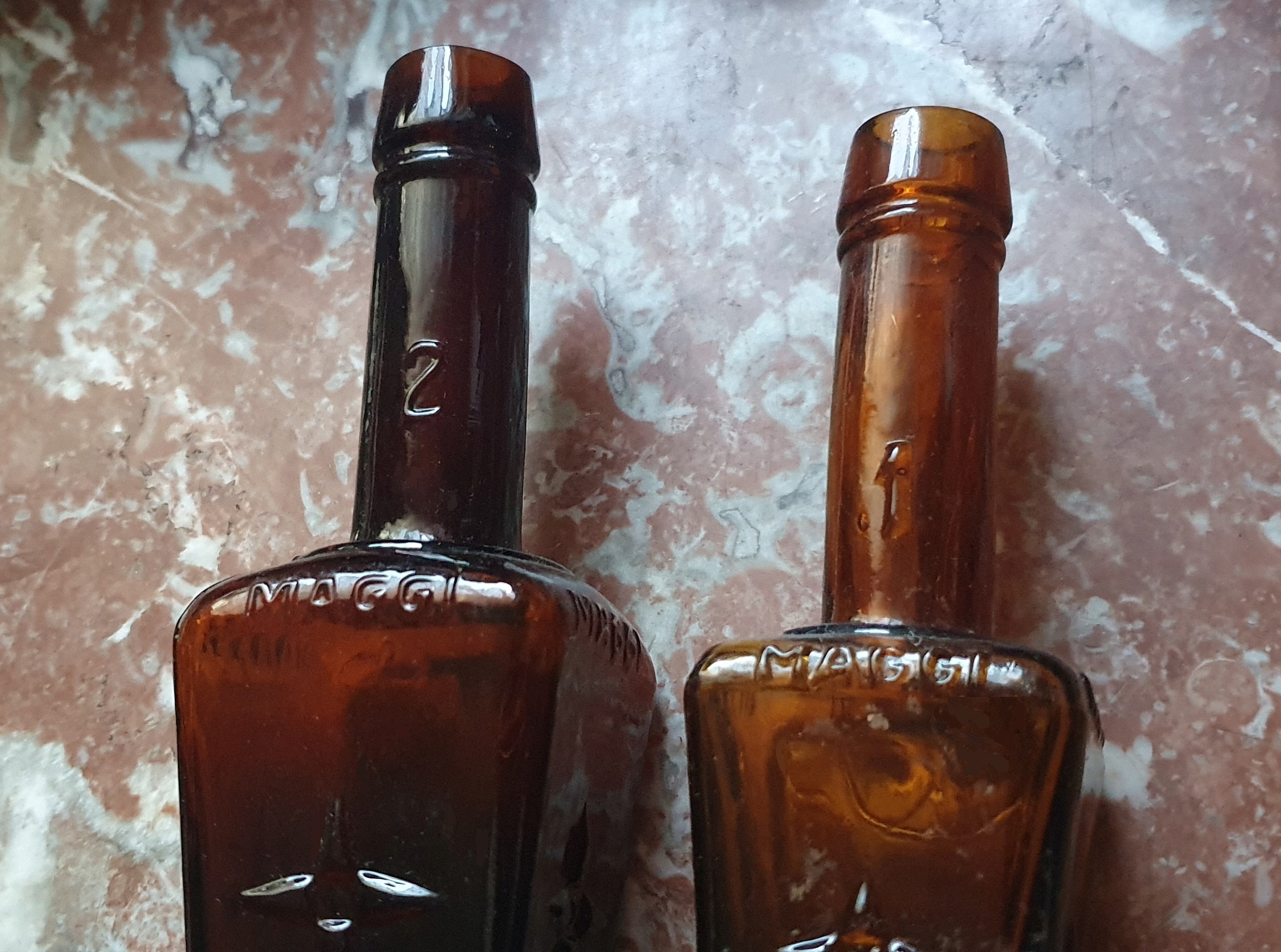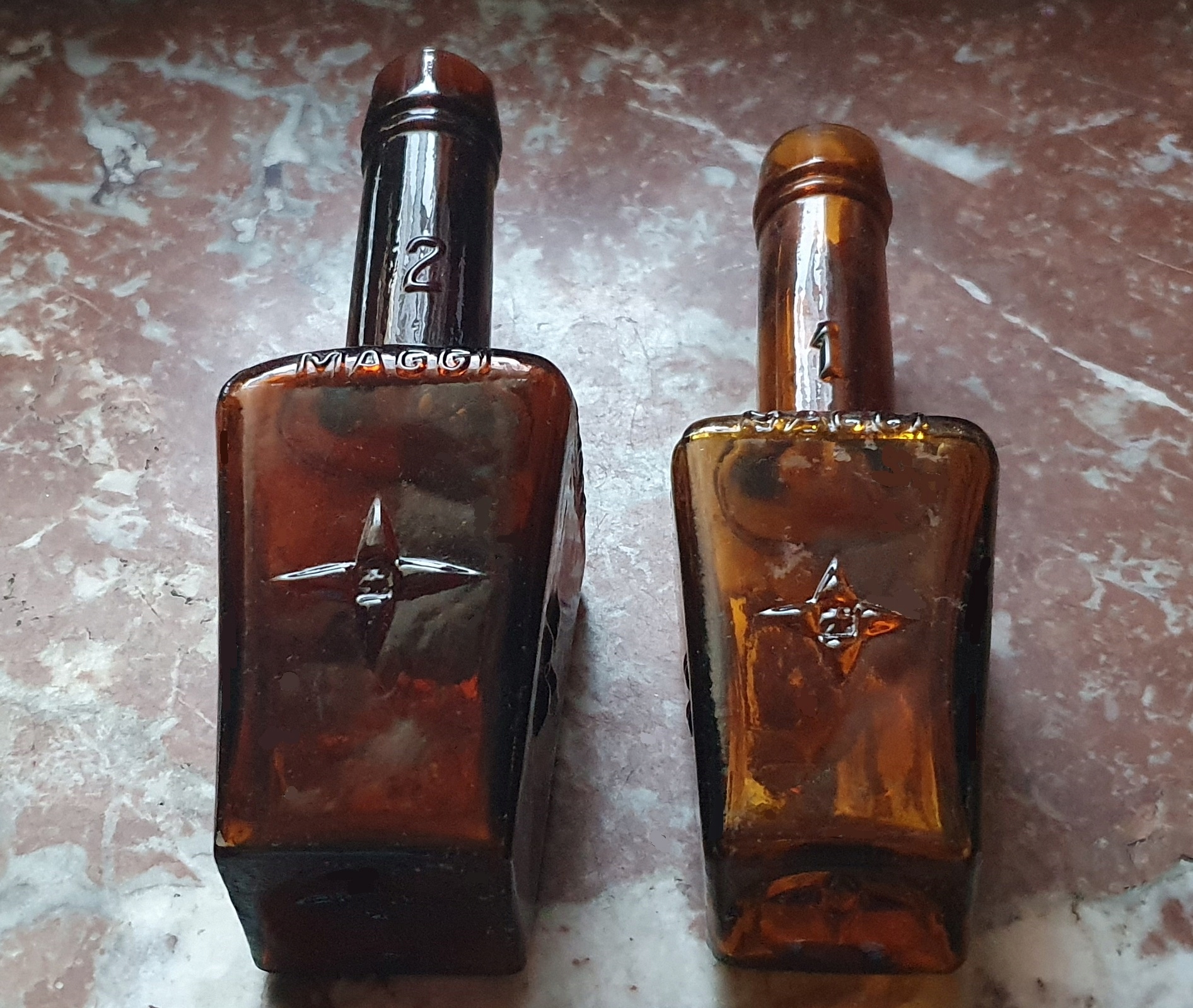 Oferuję przedwojenne dwie butle po MAGGI , numer 6 o poj. 1 L. , i dwie Maggi, typ z rozetką po bokach, numery - 1 i 2, stany ładne, bez uszkodzeń, polecam do kolekcji