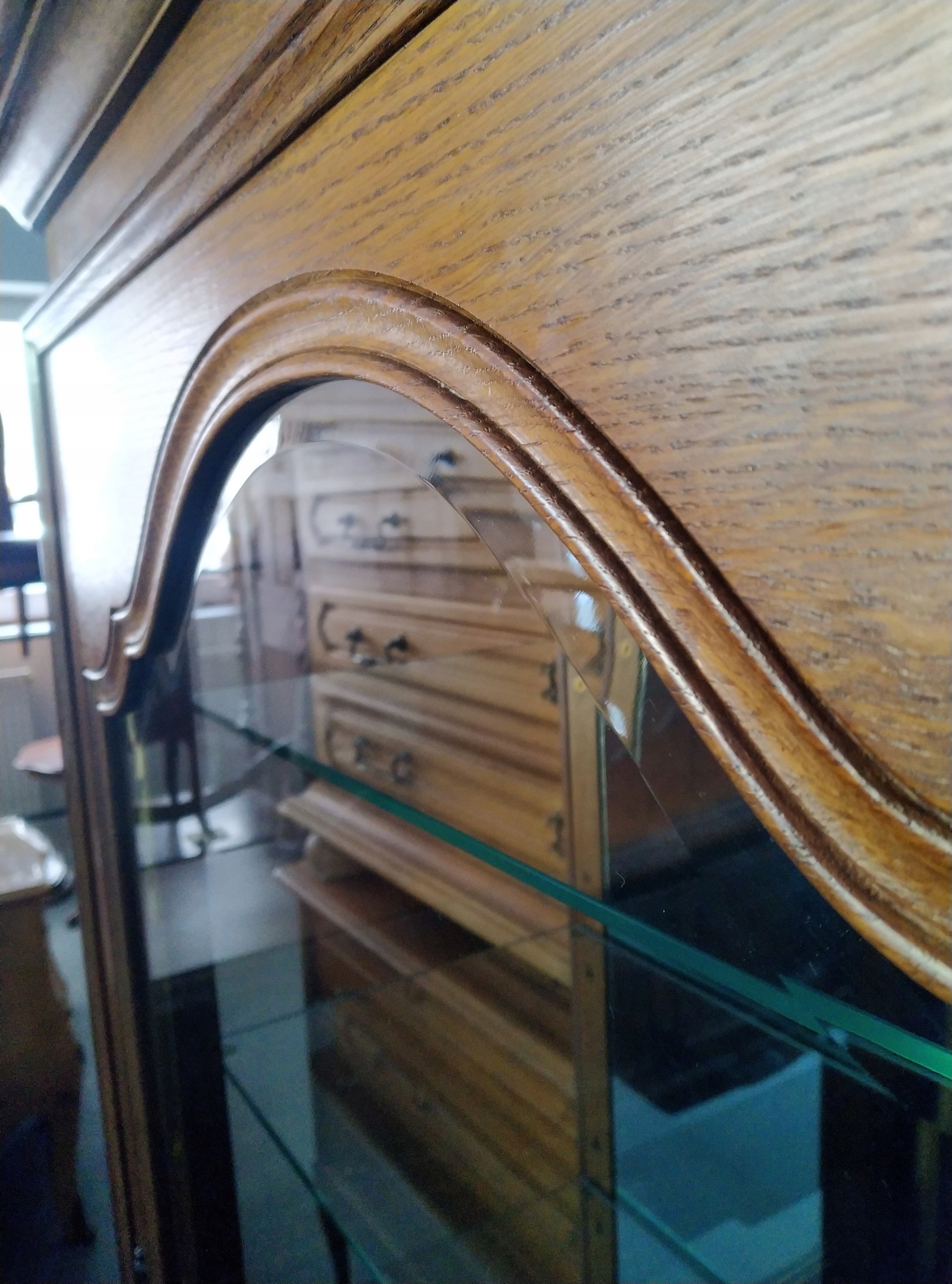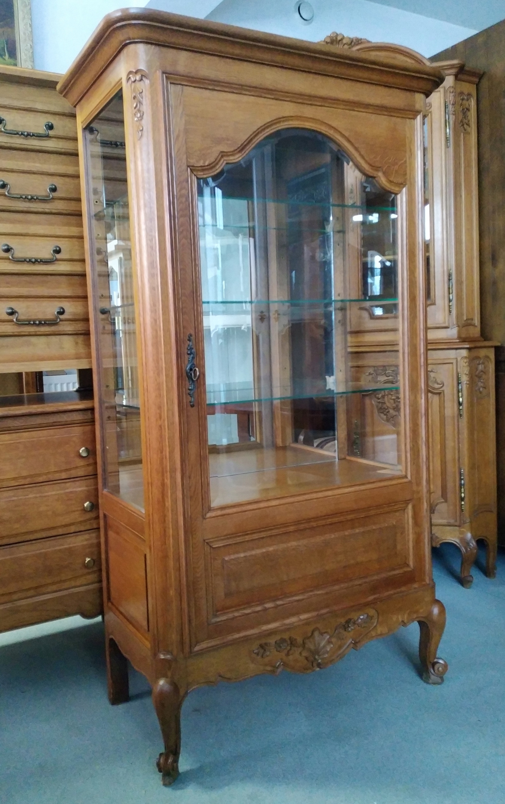 Oferuję do sprzedaży piękną witrynę gablotę w stylu ludwikowskim. Ciekawy kształt, piękne zdobienia, wykonana z litego drewna dębowego, szkło kryształowe. Witryna 1- drzwiowa, półki szklane, lustro na plecach witryny, zamykana na klucz. Witryna w bardzo dobrym stanie.