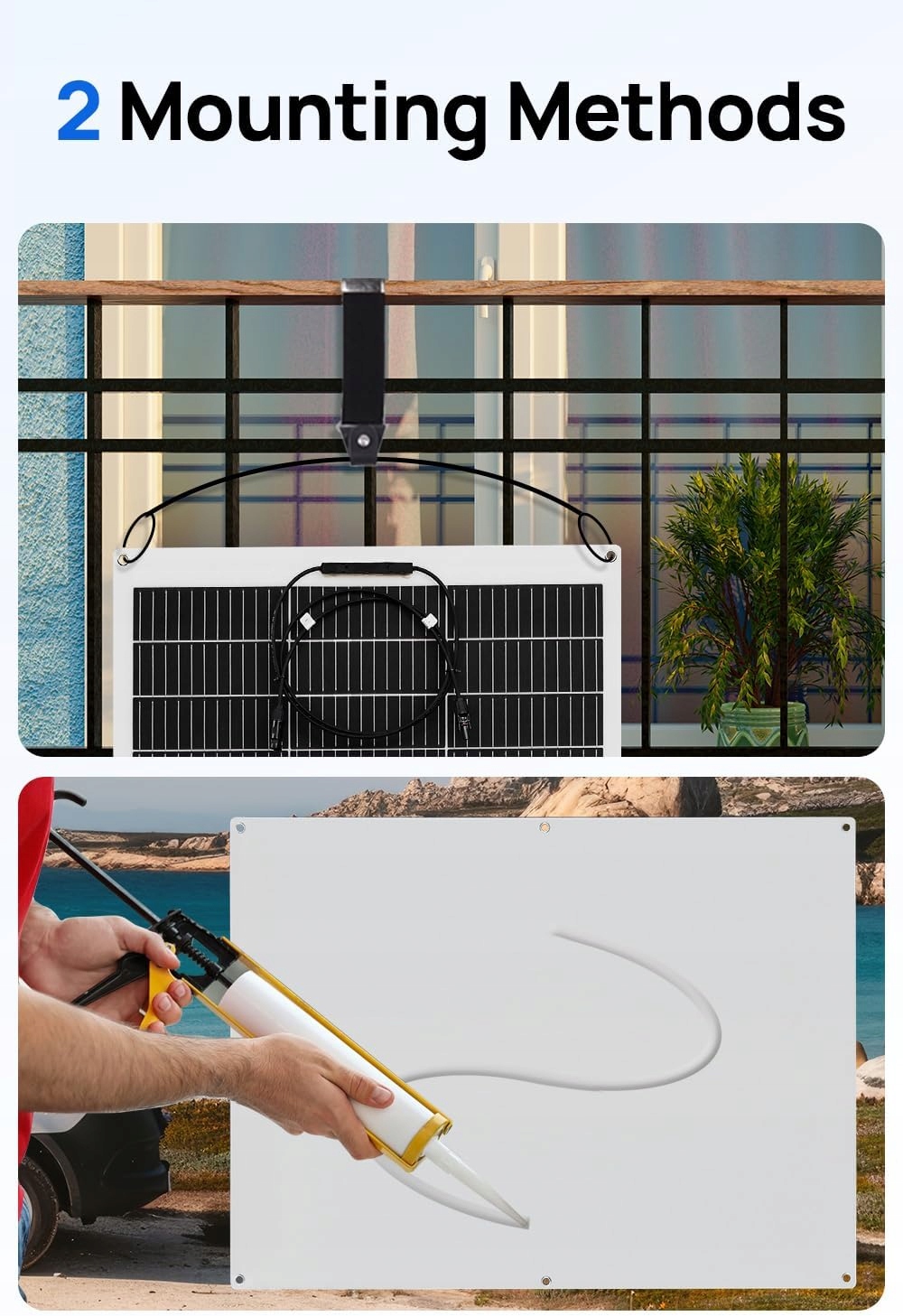 【Szybka instalacja】 4 wzmocnione metalem otwory instalacyjne są wstępnie nawiercone na krawędzi panelu słonecznego, co jest łatwe w montażu. Można ją przymocować za pomocą kleju, silikonu, dwustronnej taśmy klejącej, opasek kablowych lub rzepów, co bardzo dobrze nadaje się do instalacji niestałej.