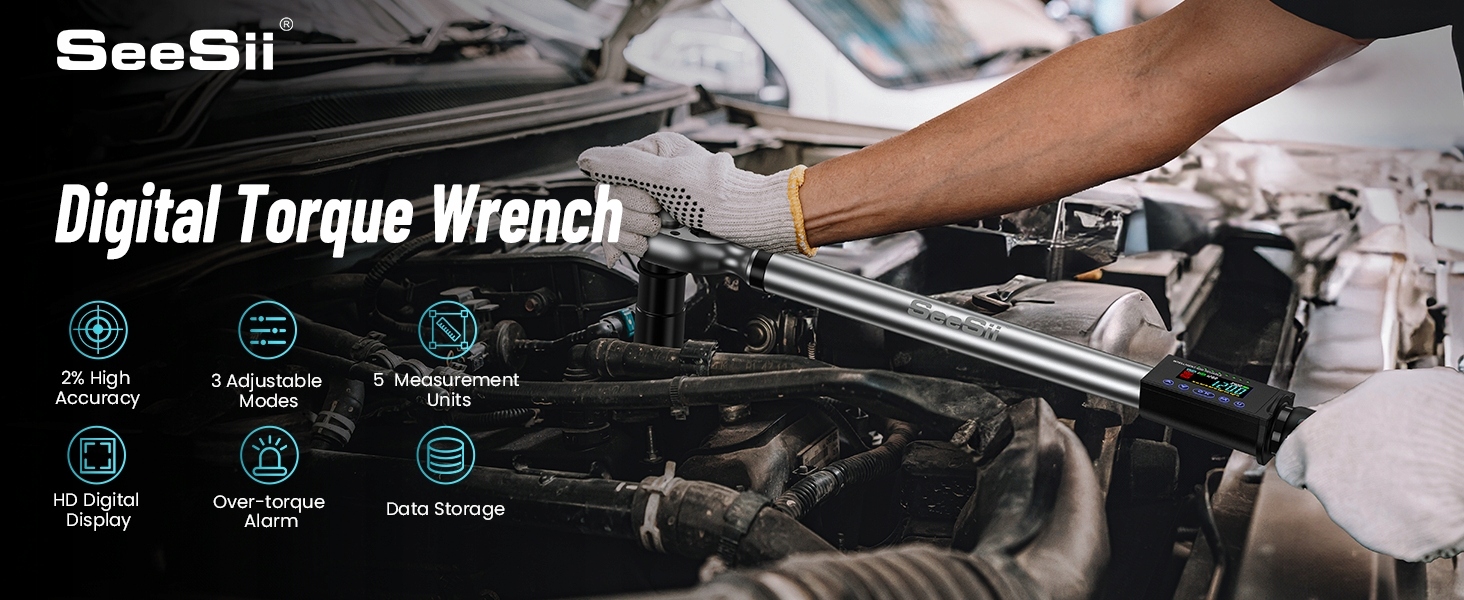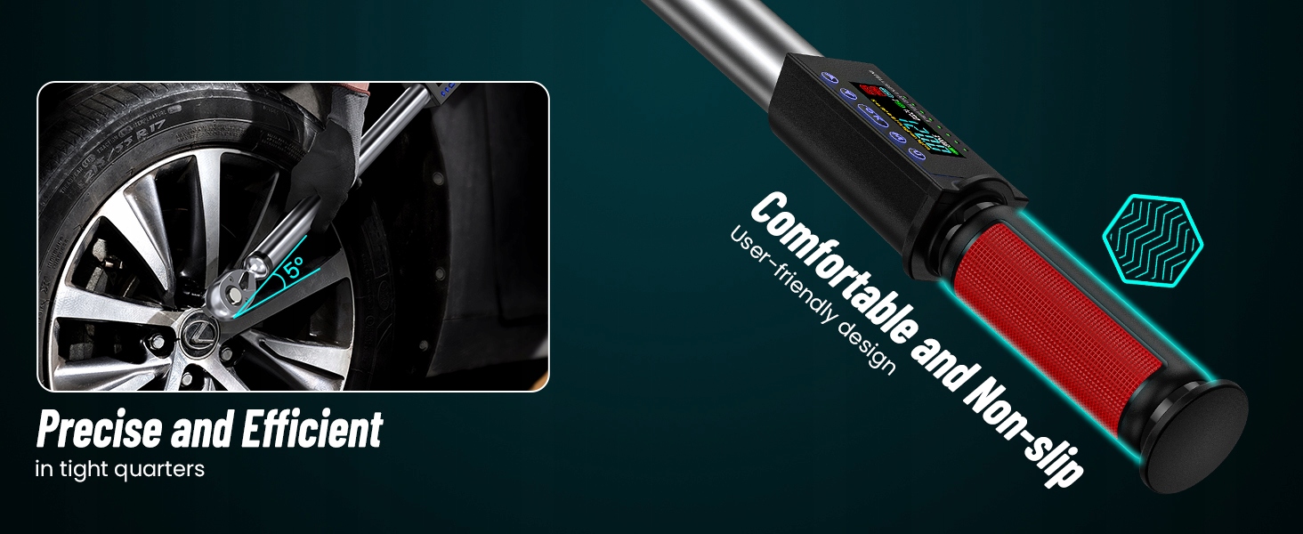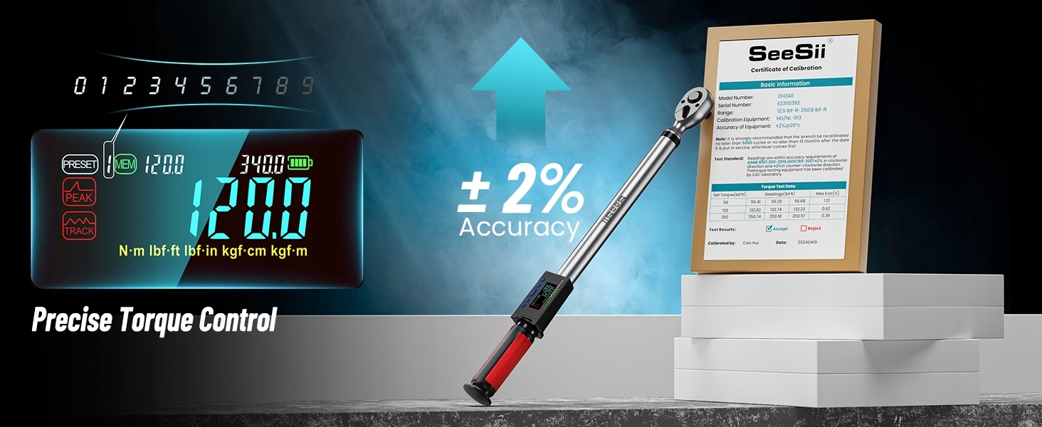 【Dokładność ±2%】Cyfrowy klucz dynamometryczny 1/2" oferuje regulowany moment obrotowy od 12,5 ft-lbs do 250,8 ft-lbs (17-340 N.m) z dokładnością 2%, zapewniając odpowiedni moment obrotowy do wymagających zadań podczas konserwacji pojazdu lub majsterkowania, umożliwiając precyzyjną kontrolę momentu obrotowego
