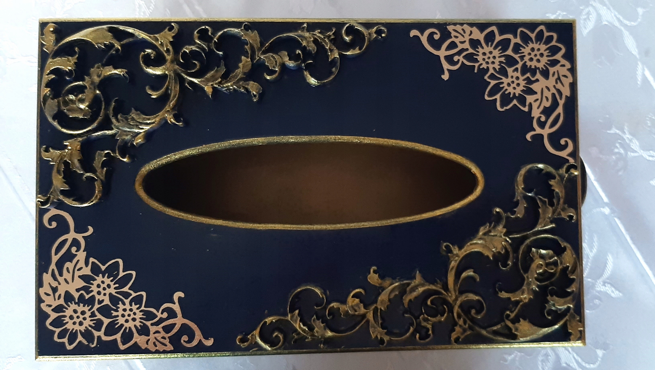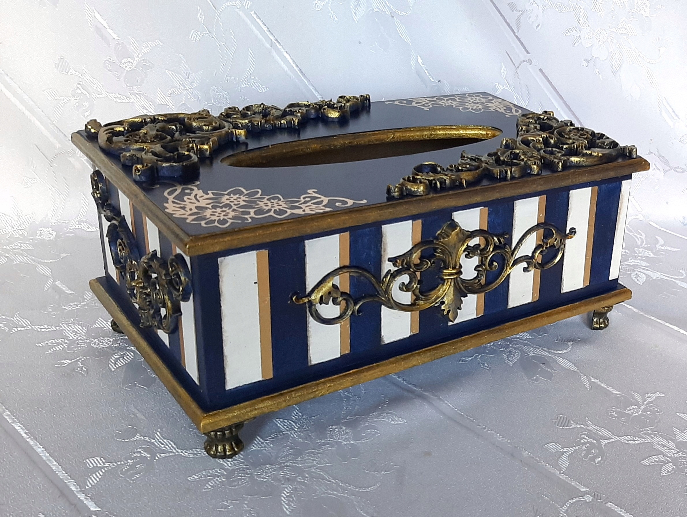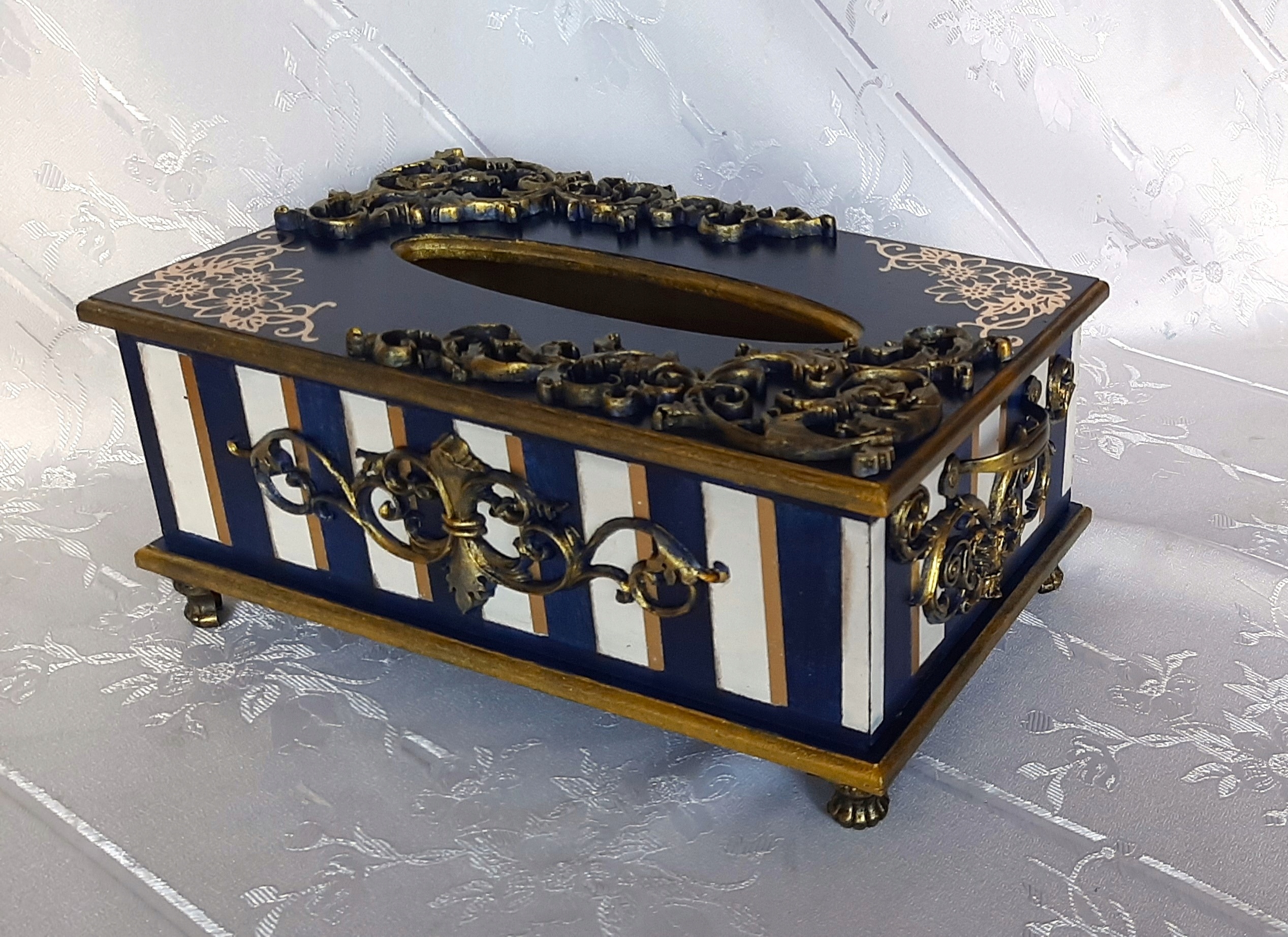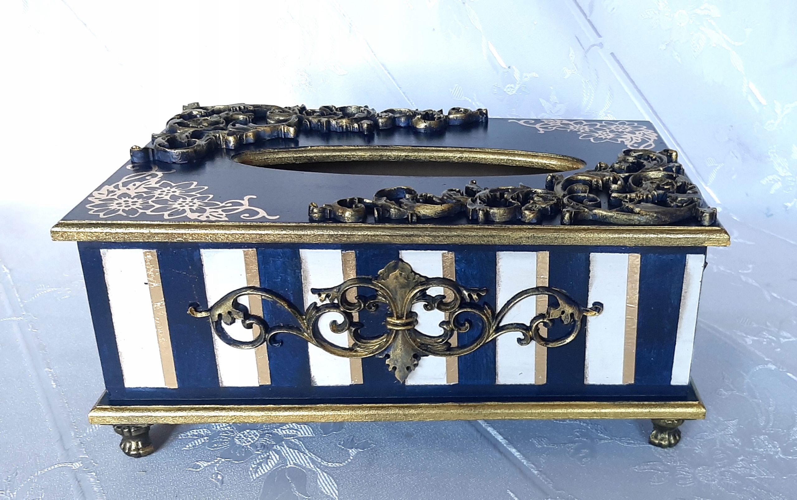Chustecznik MDF granatowo-złoty z szufladą. Nóżki i uchwyt metalowy.