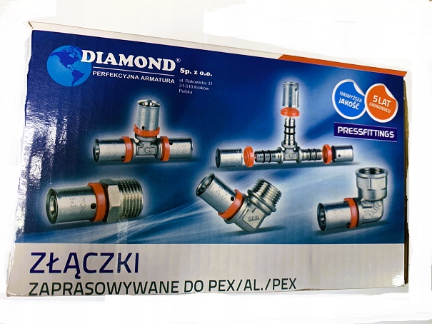 System Diamond Pex Press to kompletny system składający się z złączek mosiężnych zaprasowywanych i rur wielowarstwowych Pex/Al/Pex. Przeznaczony do instalacji centralnego ogrzewania, zimnej i ciepłej wody użytkowej oraz sprężonego powietrza. Złączki wyposażone w gwinty typu G oraz tuleje zaciskowe. Do zaprasowywania złączek należy użyć szczęki typu "U". Kształtki występują w postaci: trójników, nypli, muf oraz kolan.
