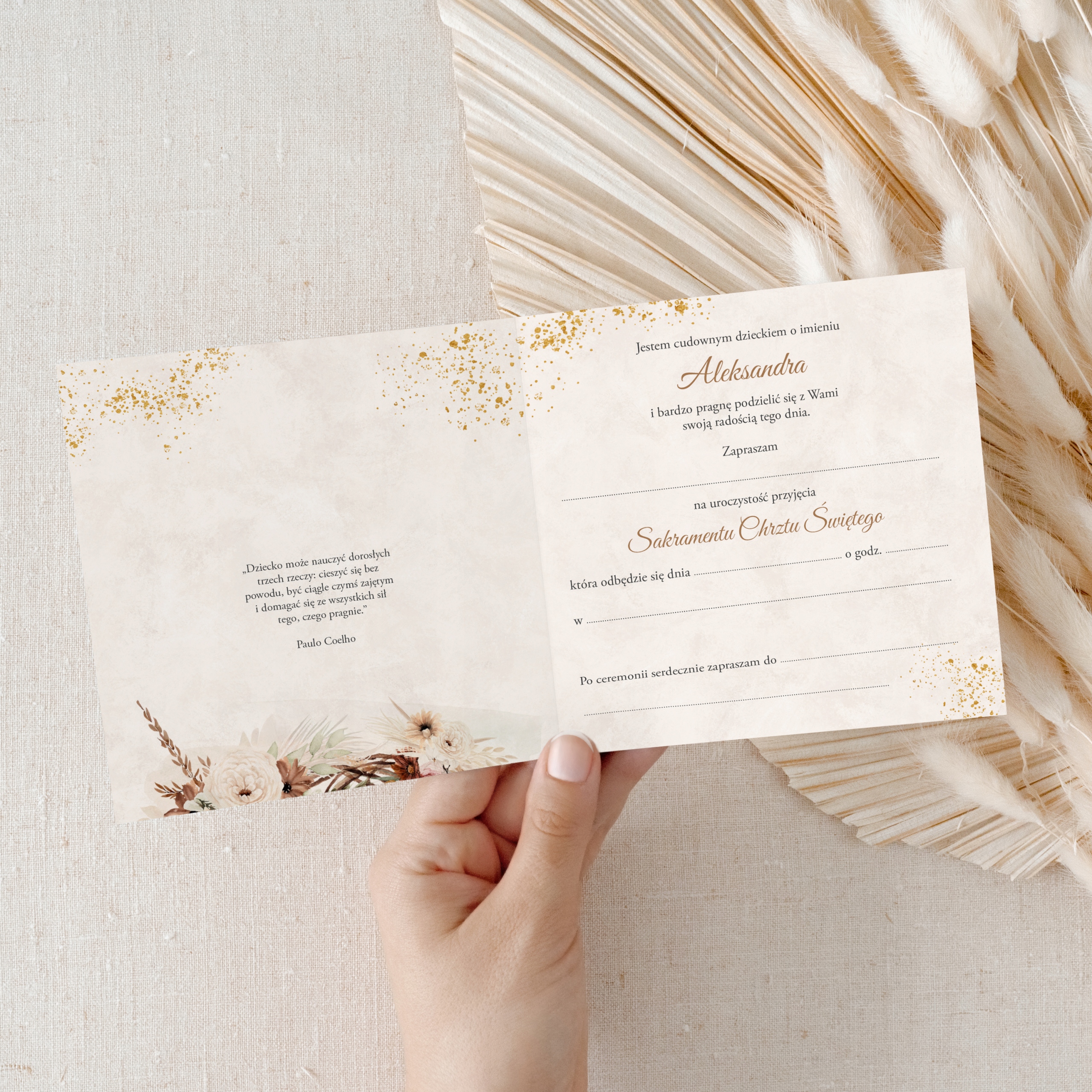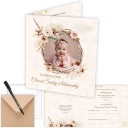 Domyślny napis na zaproszeniach to Chrzest Święty. Potrzebujesz zmienić napis np. na "Chrzest Święty i Roczek"? albo dodać prośbę o potwierdzenie przybycia gości, wystarczy że dasz nam o tym znać!