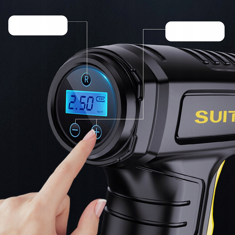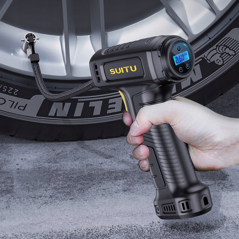 Pompka rowerowo-samochodowa Automatyczny Akumulatorowy Kompresor BEZPRZEWODOWY ładowany przez USB. Pompka automatycznie się wyłączy po osiągnięciu ustawionej wcześniej w urządzeniu granicznej wartości ciśnienia