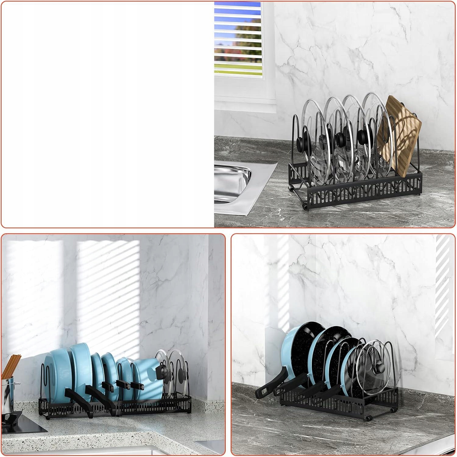 Odstępy między półkami można regulować, aby pomieścić przedmioty o różnej szerokości; półki w kształcie litery U idealnie nadają się również do pokrywek garnków. Idealne rozwiązanie do przechowywania wszystkich garnków i patelni, oszczędzające dużo miejsca w kuchni, szafkach i blatach, umożliwiając szybkie znalezienie lub wyjęcie zestawów garnków i patelni.