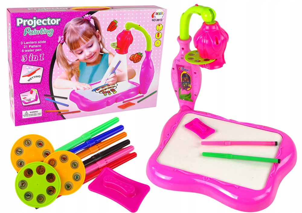 Różowy projektor w kształcie kwiatuszka jest doskonałą zabawką dla wszystkich dziewczynek, które uwielbiają rysować i malować. Zestaw kryje w sobie aż 3 różne funkcje, co jest gwarancją świetnej i długiej zabawy. Za pomocą rzutnika można kopiować obrazki z dołączonych wzorów, wyświetlać je na ścianie, a przede wszystkim tworzyć własne, oryginalne prace.