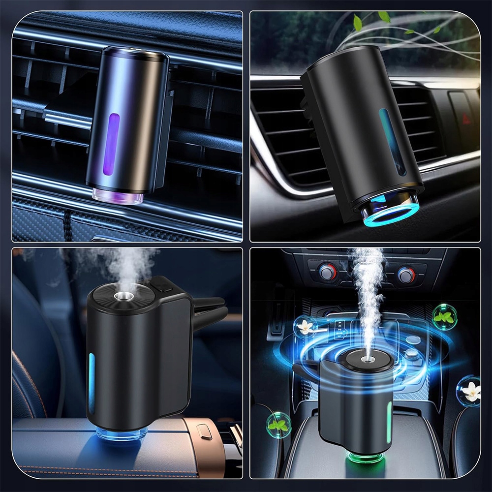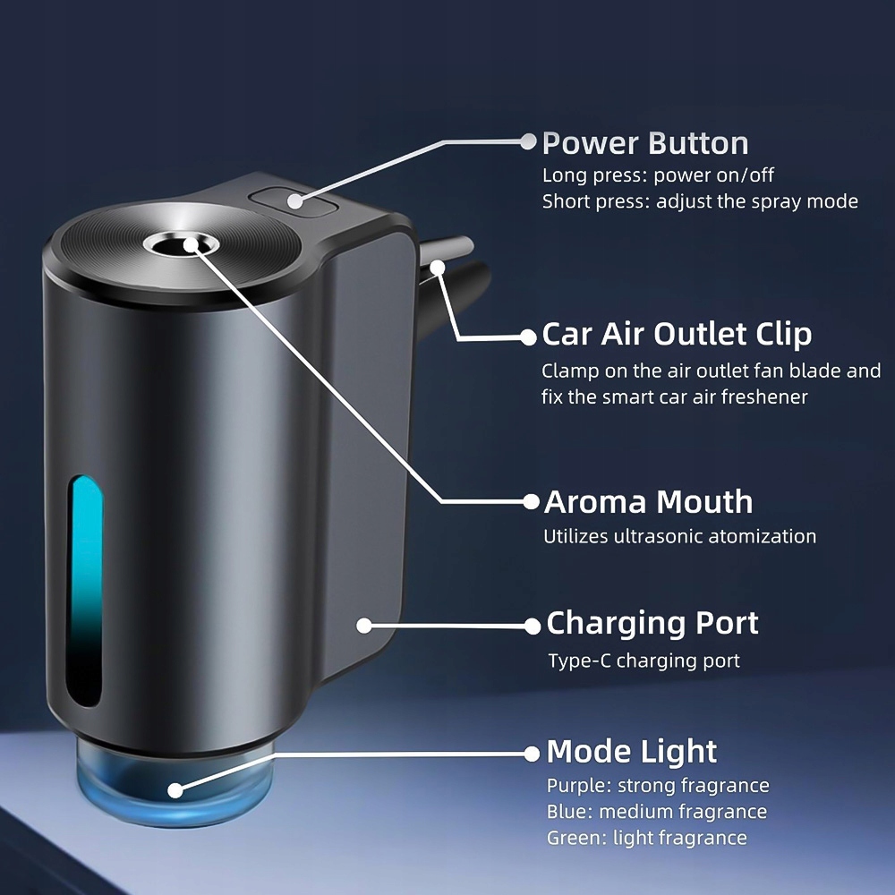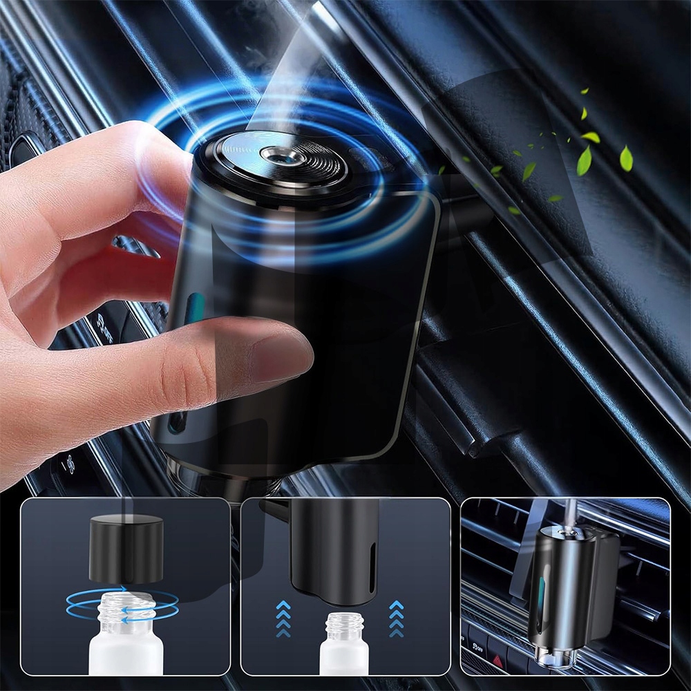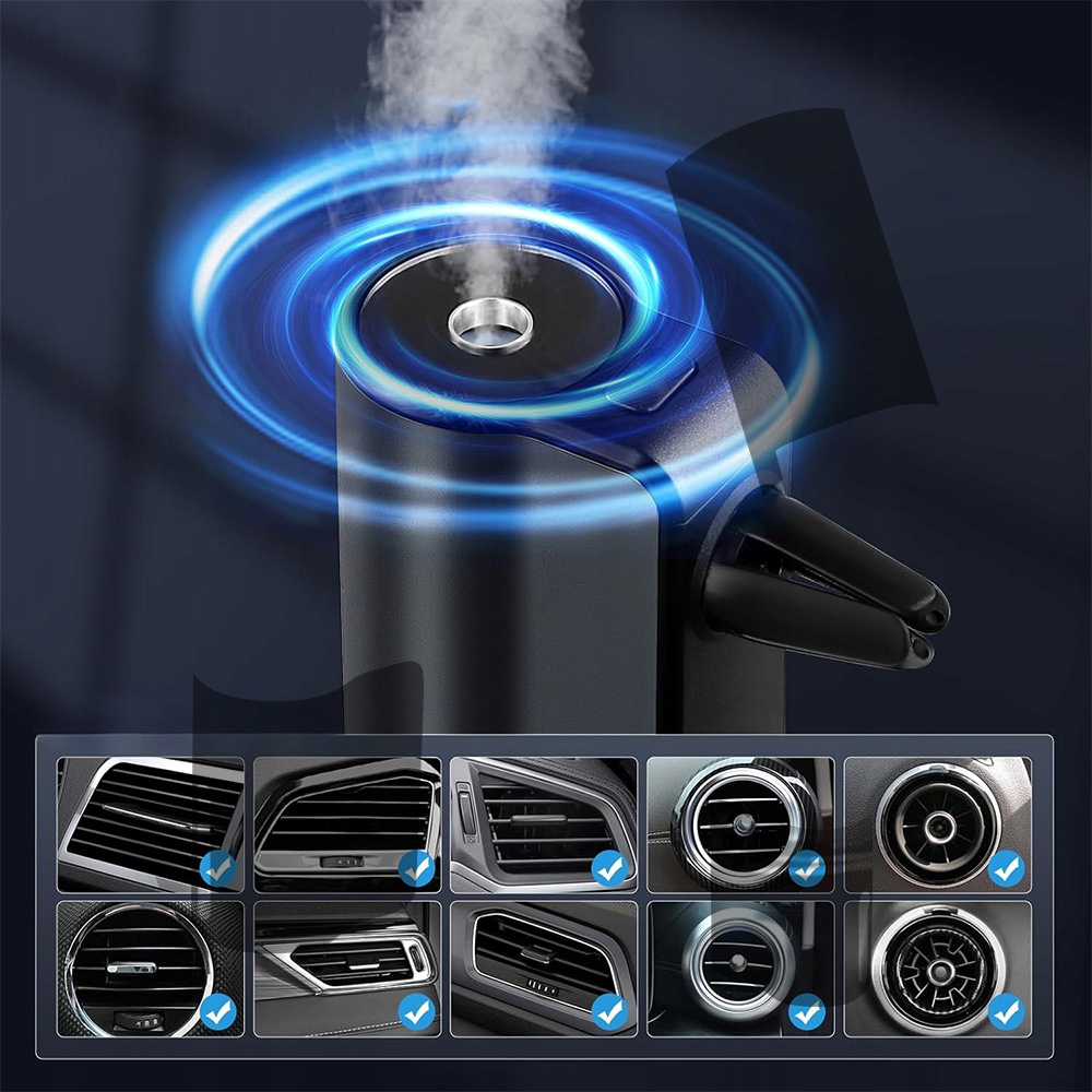 Inteligentny dyfuzor odświeżacza powietrza do samochodu wykorzystuje technologię atomizacji ultradźwiękowej do rozpylania delikatnej mgiełki zapachowej. Przy wietrze z klimatyzacji pachnące powietrze krąży po całej kabinie, z łatwością eliminując różne zapachy. Dostarczone 3 butelki perfum są wykonane z naturalnych ekstraktów roślinnych. Mają odświeżający zapach, który nie jest drażniący i nie ma skutków ubocznych dla dzieci i osób starszych.