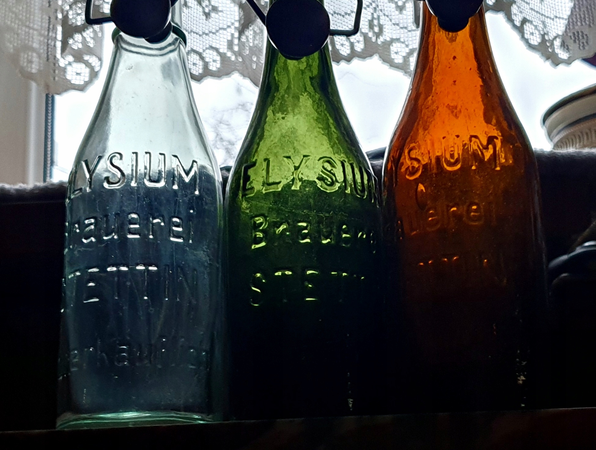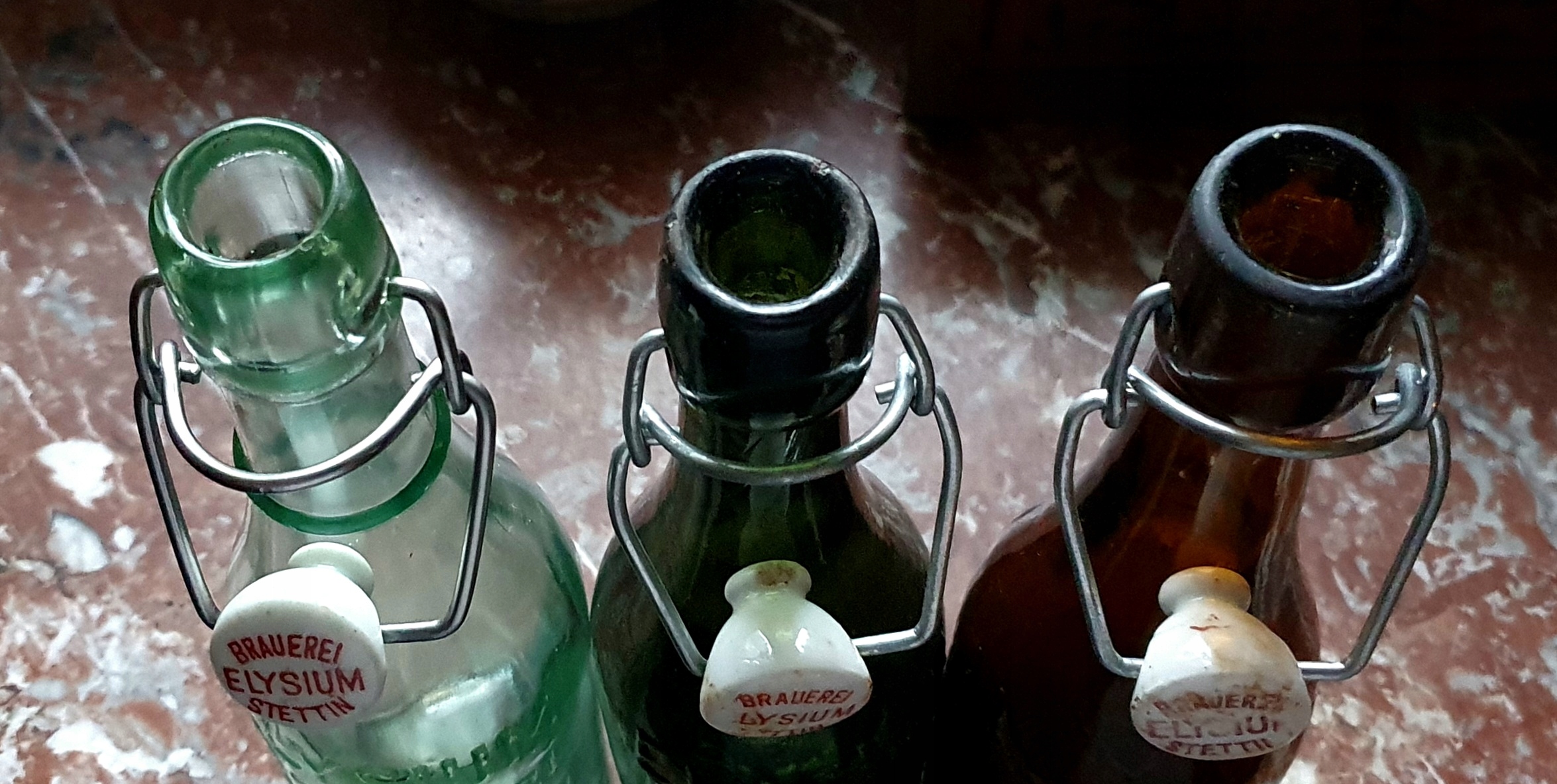 3 butelki ze szczecińskiego browaru ELYSIUM - ta pierwsza z lewej z pierścieniem na szyjce jest późniejsza a te dwie z prawej bez pierścienia to wcześniejszy wzór tej butelki - stany ładne, bez uszkodzeń , w kółku na butelkach zaznaczyłem różnice w formie graficznej literki M , oryginalne porcelanki, umyte, poj. 0.33L