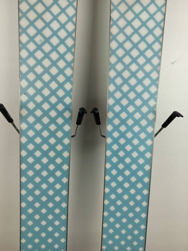 Minimalne pojedyncze ślady użytkowania - drobne ryski na szacie graficznej nart i wiązań.