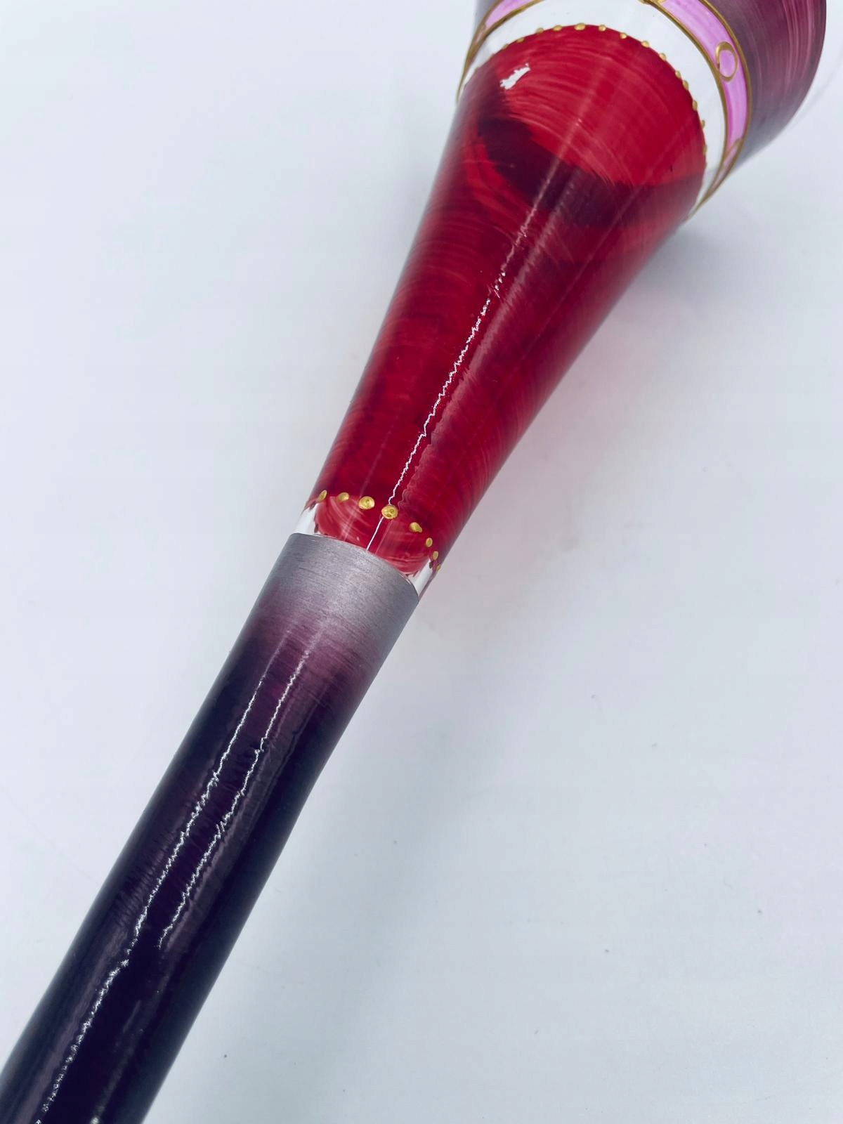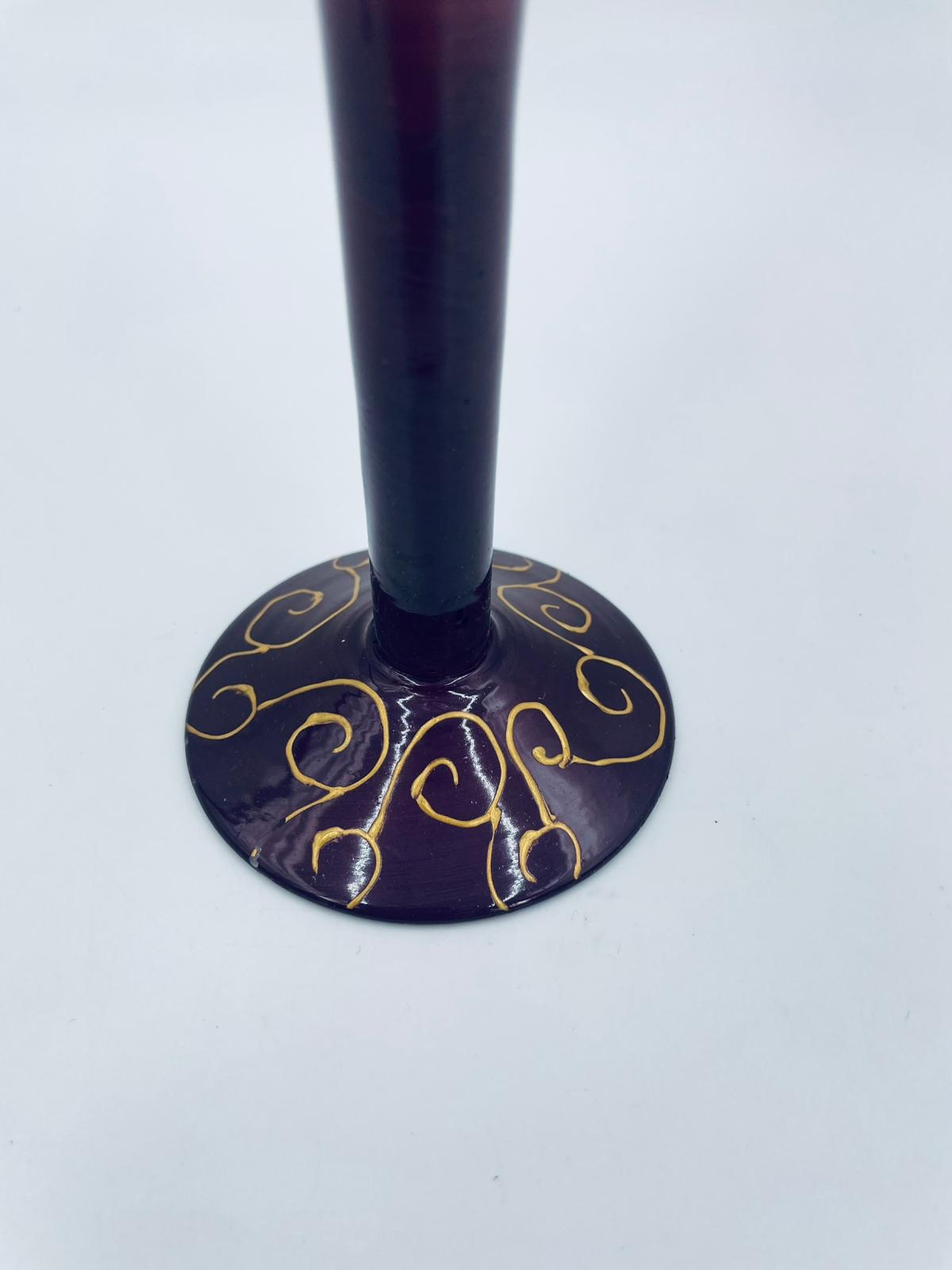 Kieliszek do szampana w stylu Vintage, wykonany z wysokiej jakości szkła. Kieliszek ręcznie malowany na fioletowo-bordowy kolor ze złotymi akcentami. Posiada otarcie na kolorze.