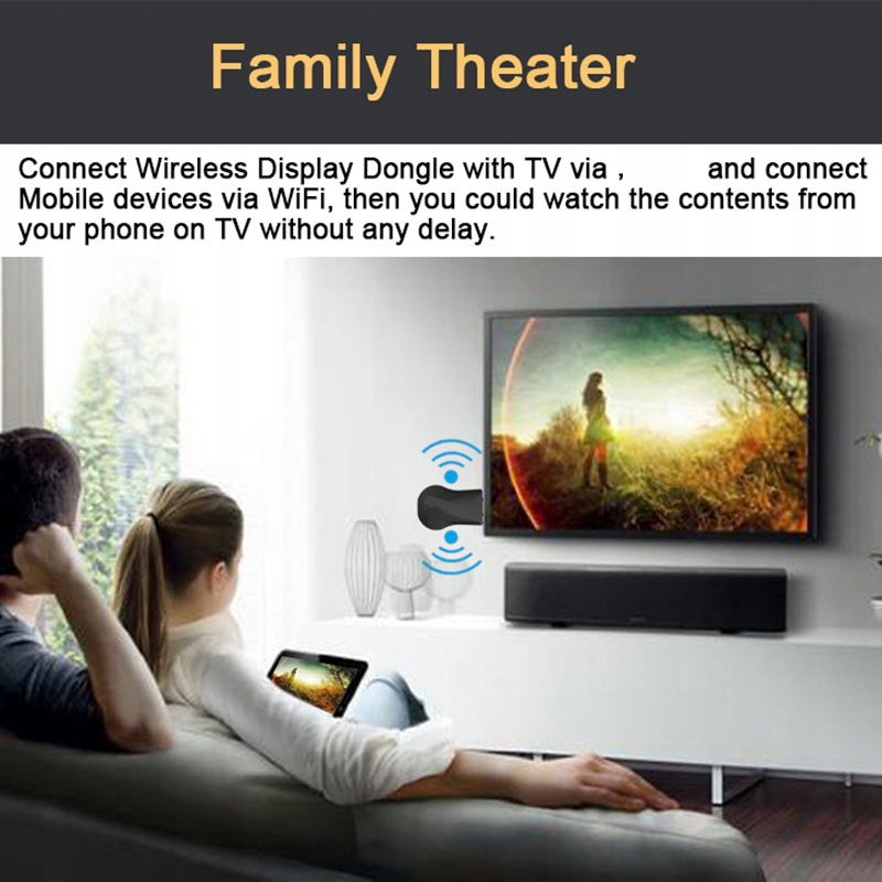 3: Podłącz bezprzewodowy klucz sprzętowy z telewizorem za pomocą interfejsu multimedialnego wysokiej rozdzielczości i podłącz urządzenia mobilne przez WiFi, a następnie możesz oglądać zawartość z telefonu w telewizji bez żadnych opóźnień.