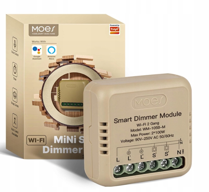 Możliwość ściemniania w zakresie 0–100%: jasność można regulować głosem lub za pomocą aplikacji MOES/Mart Life. Działa z żarówkami LED, żarówkami żarowymi i halogenowymi. Niekompatybilne z świetlówkami kompaktowymi (CFL) ani świetlówkami fluorescencyjnymi.