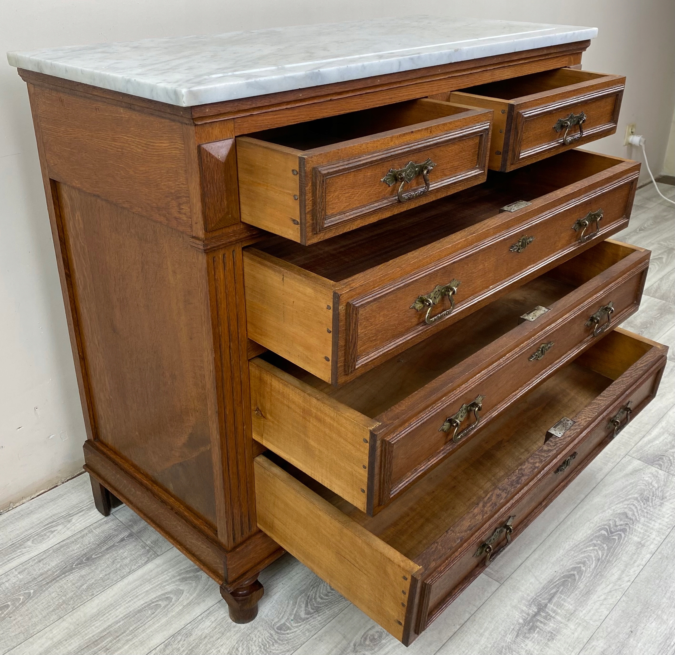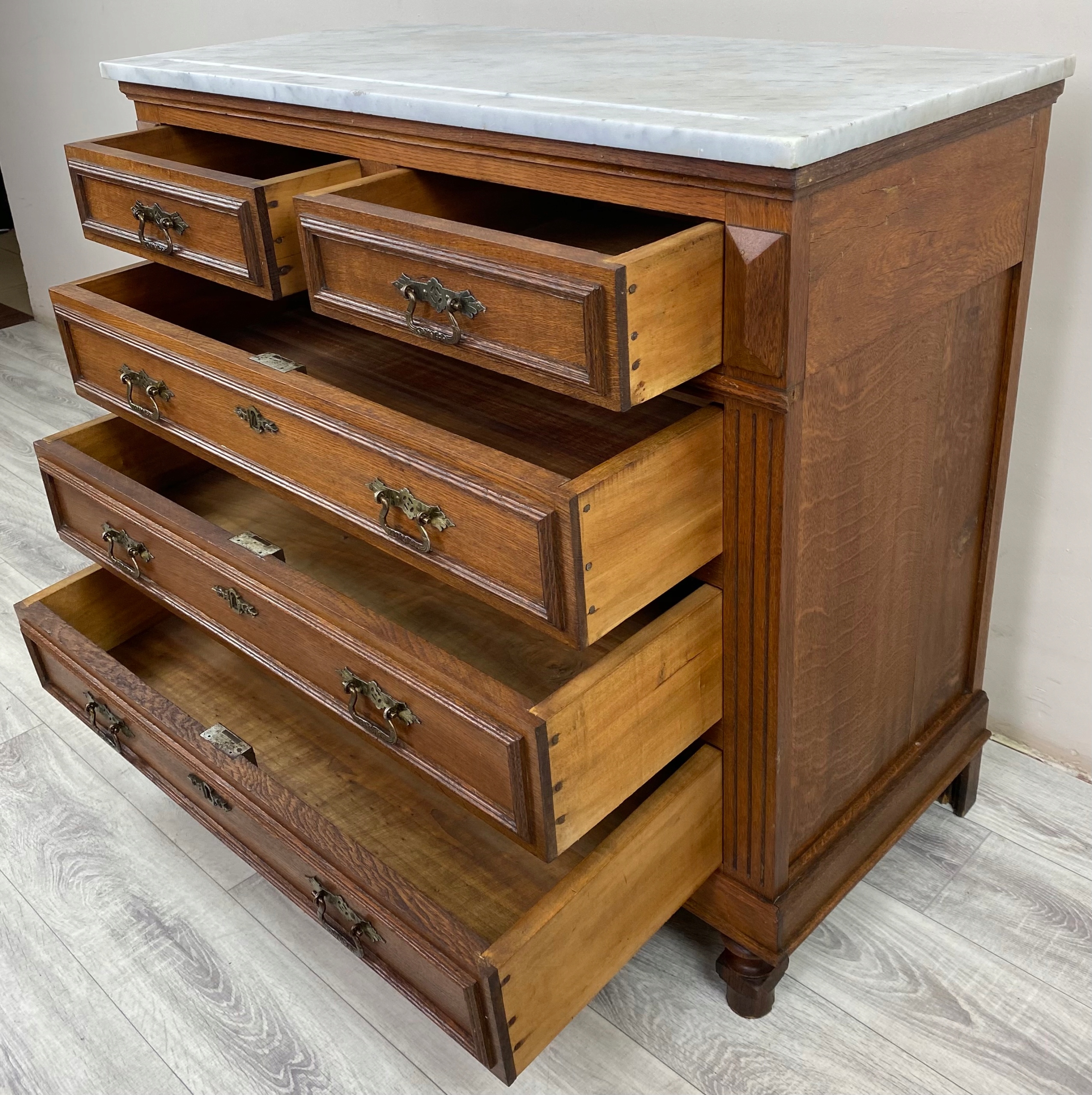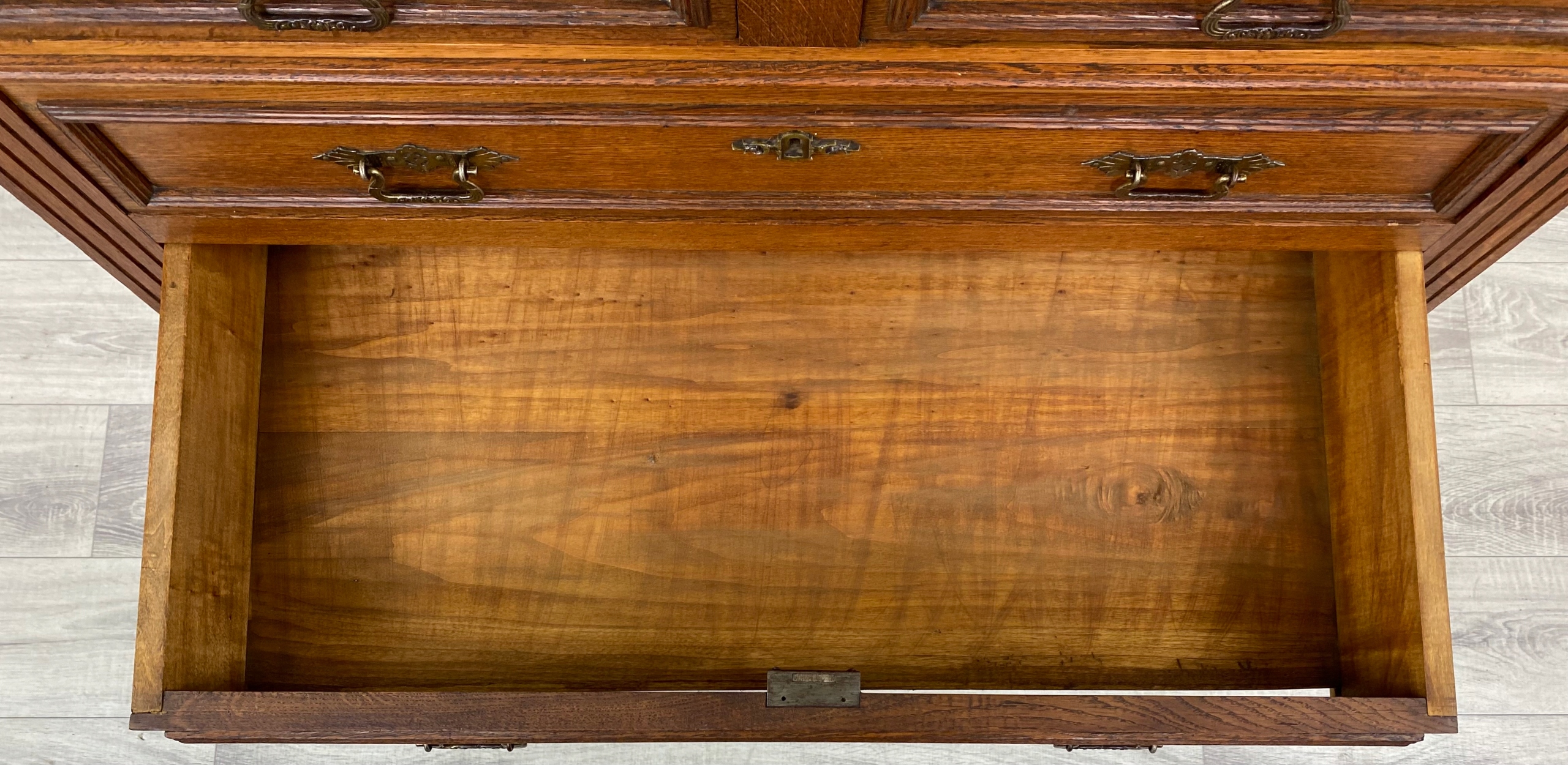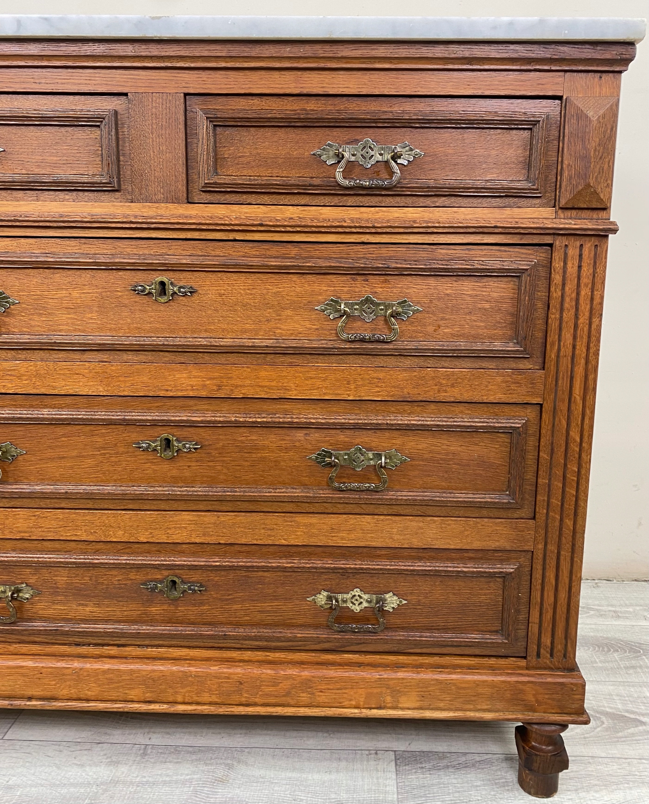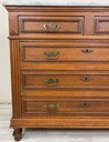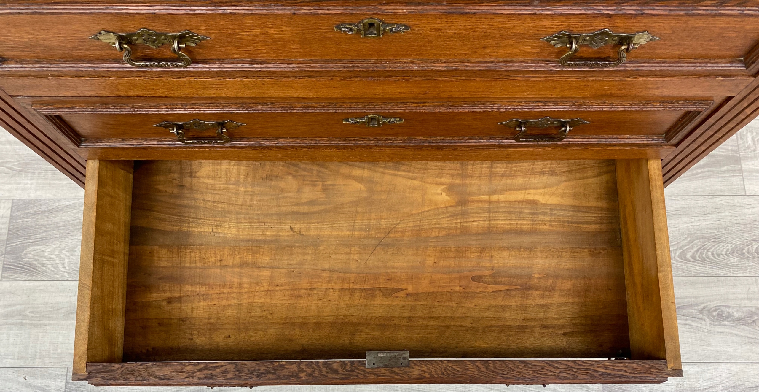 Układ: u góry dwie mniejsze szuflady, poniżej trzy szerokie, głębokie szuflady.