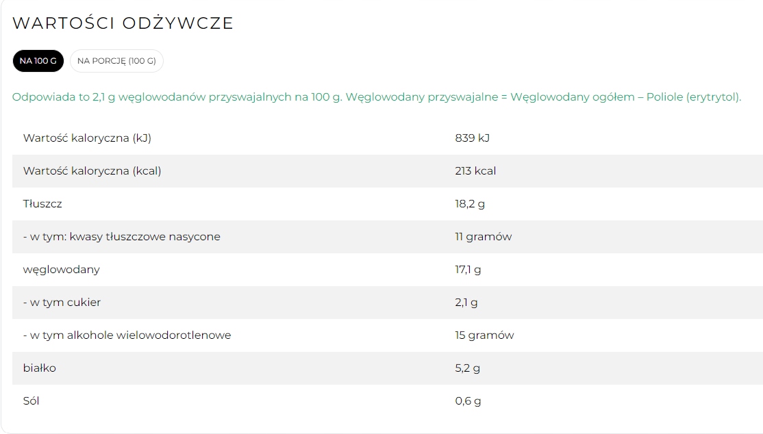 Produkt jest słodzony naturalnymi słodzikami (erytrytol, xylitol, stewioglikozydy), co ogranicza skoki glukozy i pomaga zachować stabilny metabolizm.