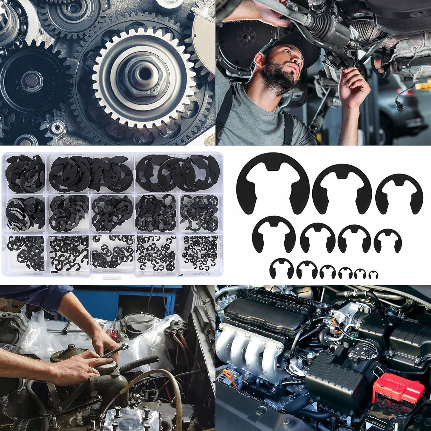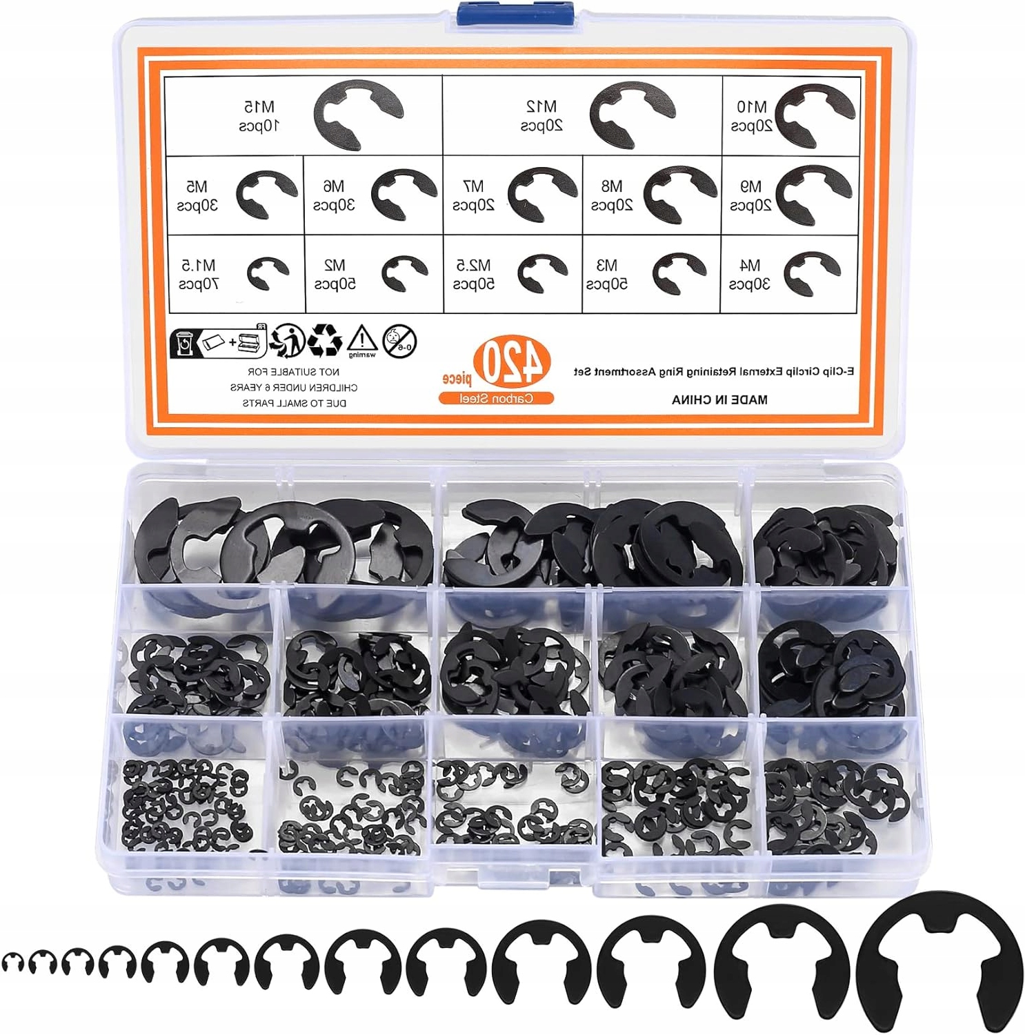 Praktyczny zestaw 420 sztuk E-Clips do blokowania luzu na wałkach i w obudowach. Wykonane z hartowanej stali węglowej, czarne. Zawiera rozmiary: M10, M12, M15, M9, M8, M7, M6, M5, M4, M3, M2,5, M2, M1,5. Całość zapakowana w przeźroczystą skrzyneczkę do łatwego transportu.