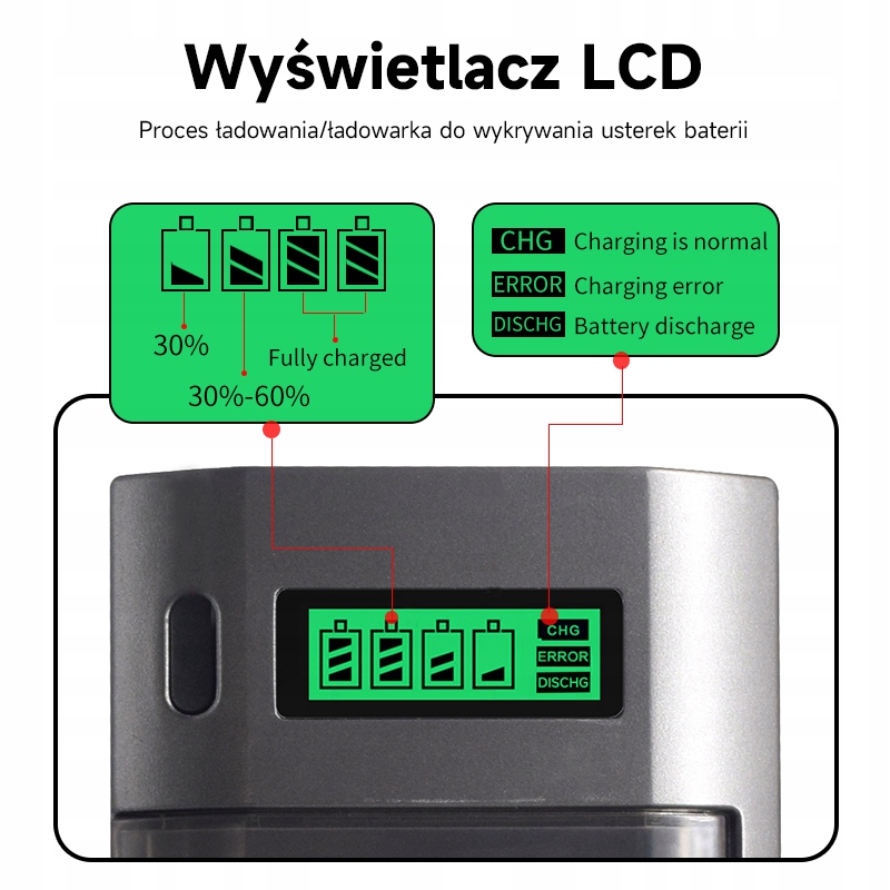 3. Ekran LCD i lampka LED pokazują proces ładowania, LCD dla baterii AA AAA C D, dioda LED dla baterii 9 V.