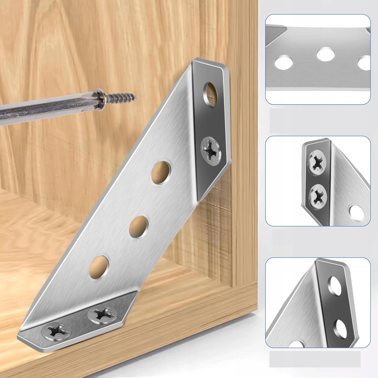 Nasze wsporniki narożne i śruby są wykonane z wysokiej jakości stali nierdzewnej, odpornej na rdzę i korozję, nie ulegają łatwo deformacji, zapewniają mocne podparcie, są solidne, wytrzymałe i trwałe. Trójkątny wspornik do drewna ma gładką i błyszczącą powierzchnię, która jest bezpieczna i nie rysuje łatwo palców ani mebli.