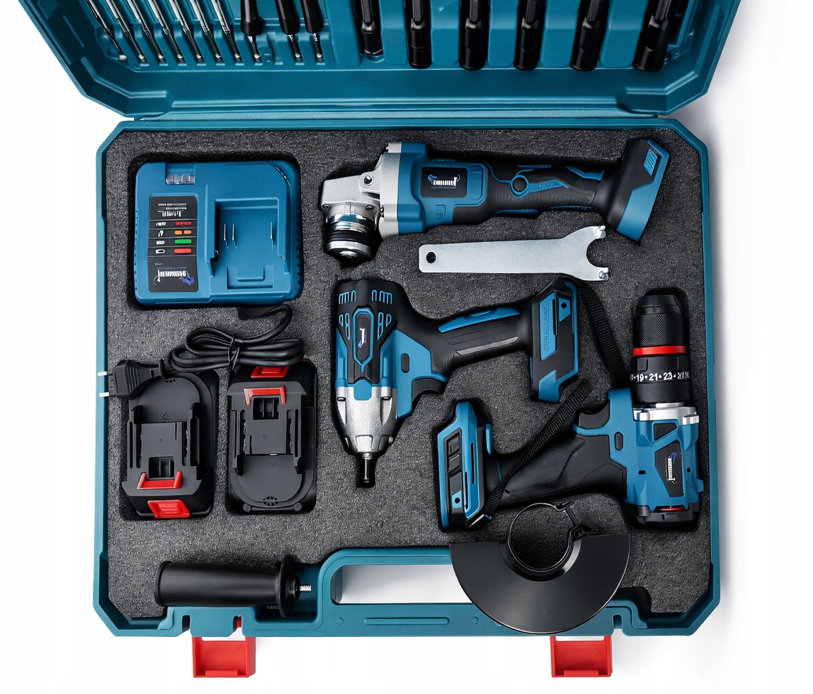 ✔️ Konstrukcja włącznika i jego położenie w środkowej części elektronarzędzia ułatwiają pracę. Świetnie leży w dłoni a załączona do zestawu rączka, którą można zamontować z dwóch stron, zwiększa stabilność urządzenia podczas pracy