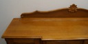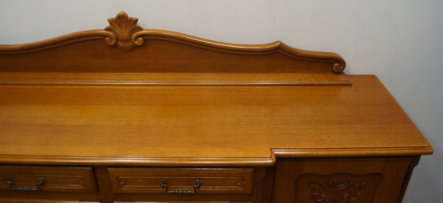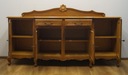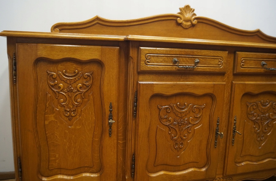 Komoda posiada czworo drzwiczek oraz szufladki. Komoda zdobiona rzeźbieniami, spoczywa na pięknych kabriolowych nóżkach. Dół wykończony dekoracyjną falbanką. Mebel ten jest niepowtarzalny i wyjątkowy.