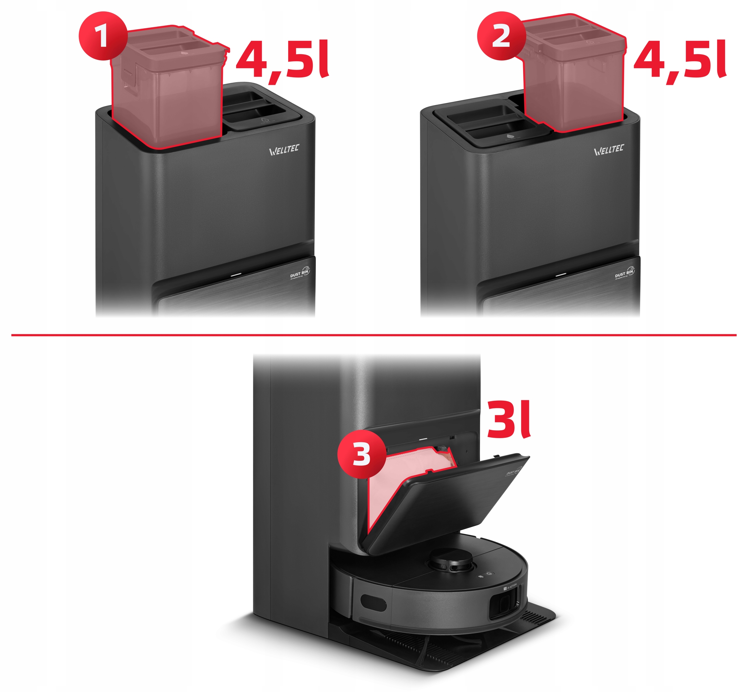 ✅ Welltec R90 Pro jest wyposażony w wydajną, wielofunkcyjną stację dokującą. Stacja posiada 3 oddzielne, łatwo dostępne zbiorniki - na wodę brudną 1️⃣, wodę czystą 2️⃣ i kurz 3️⃣. Dolna część stacji wyposażona została w styki ładowania z czujnikami, porty do zasysania kurzu, mycia mopów i zbierania brudnej wody, podstawkę czyszczącą i dyszę gorącego powietrza. Dzięki rozbudowanej konstrukcji, stacja dokująca robota R90 Pro zapewnia użytkownikowi bezprecedensową wygodę.
