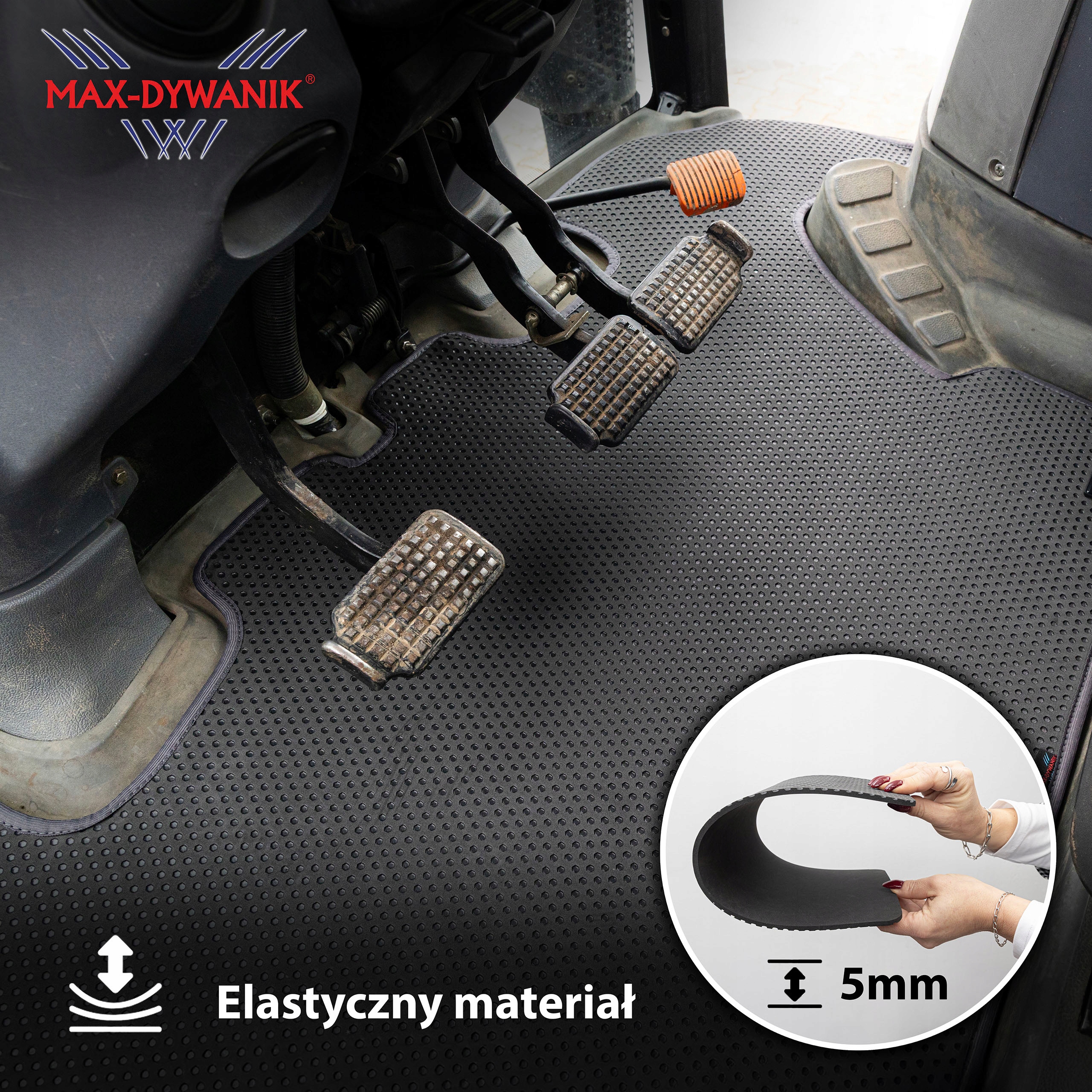 Ekskluzywny emblemat MAX-DYWANIK – Made for Professionals, wykonany w technologii 3D i osadzony na autorskim mocowaniu, jest w pełni odporny na wodę, błoto i warunki atmosferyczne.